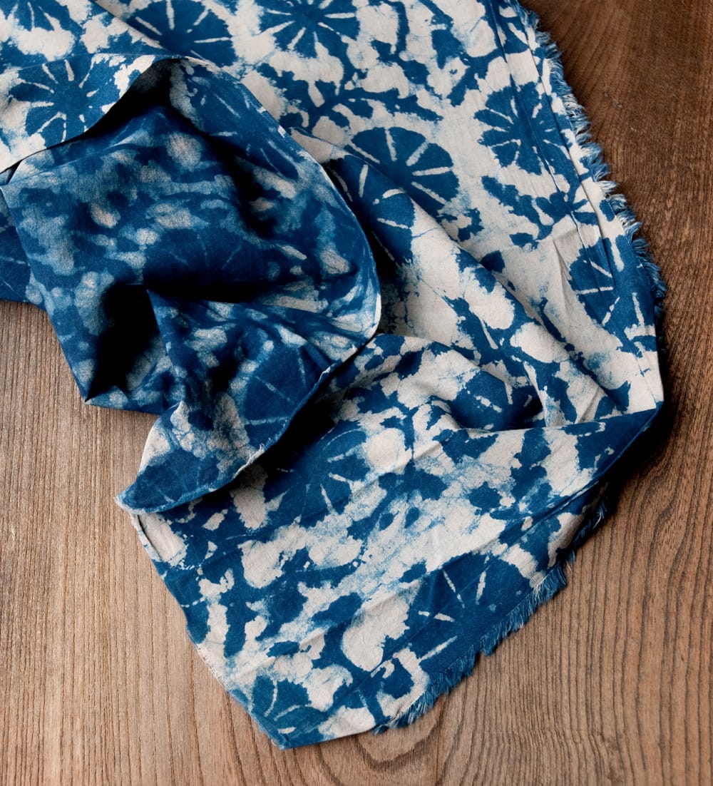 インドらしい伝統的な模様にインディゴの美しい青がマッチングした素敵な布です。泥染め(ダブプリント)によるシンプルなパターンの連なりと落ち着いた風合いは見ていて決して飽きることがありません。泥染めは、布地が染まるのを防ぐ泥状のペーストを模様が彫られたウッドブロック(木版)につけて布に押していきます。そして布につけたペースとへ、細かくなった小麦の籾殻を撒きます。そうすると小麦の皮が先ほどの泥にくっついてくれるので天日干しします。