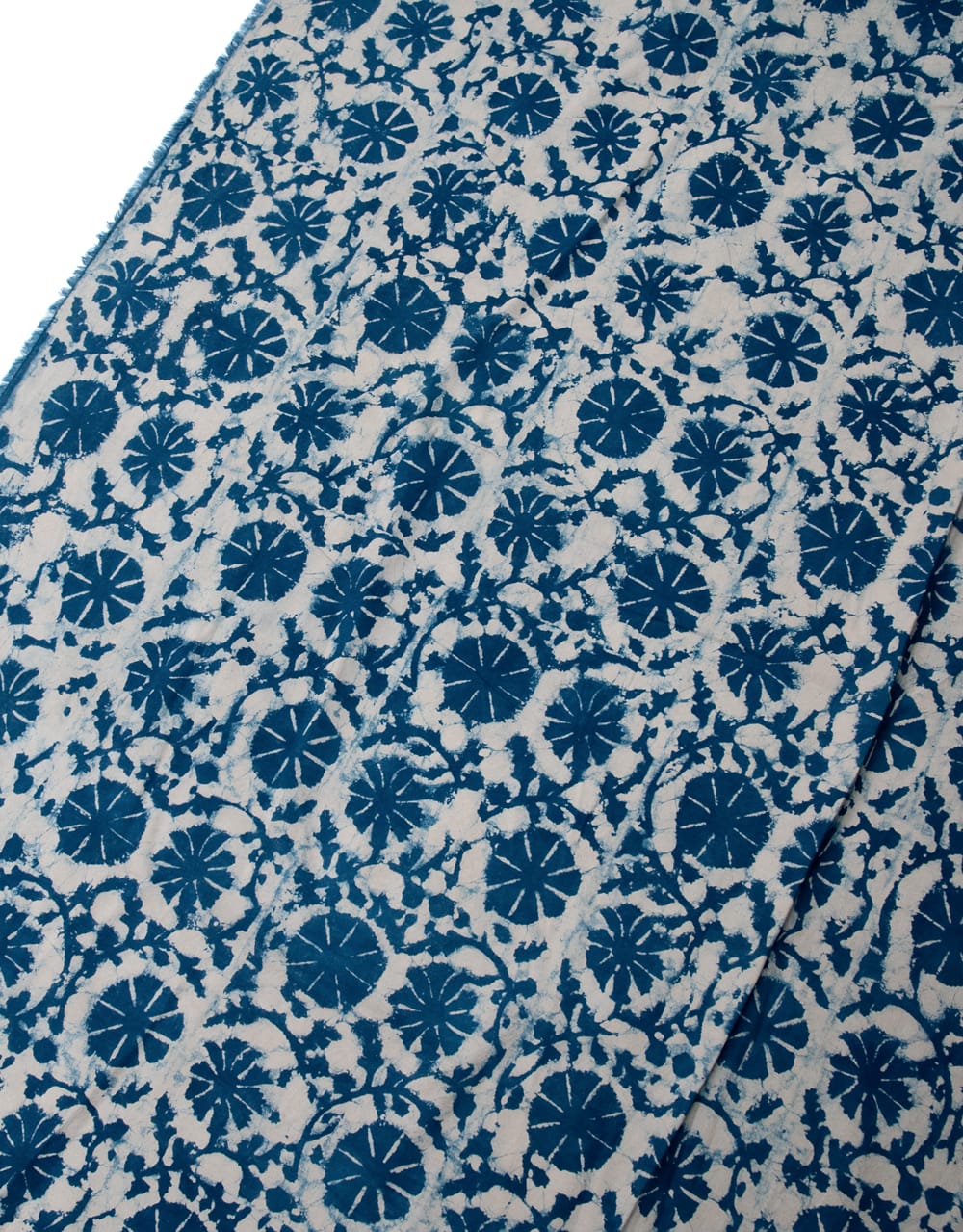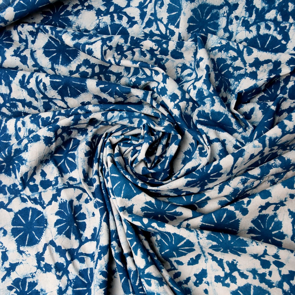 インドらしい伝統的な模様にインディゴの美しい青がマッチングした素敵な布です。泥染め(ダブプリント)によるシンプルなパターンの連なりと落ち着いた風合いは見ていて決して飽きることがありません。泥染めは、布地が染まるのを防ぐ泥状のペーストを模様が彫られたウッドブロック(木版)につけて布に押していきます。そして布につけたペースとへ、細かくなった小麦の籾殻を撒きます。そうすると小麦の皮が先ほどの泥にくっついてくれるので天日干しします。