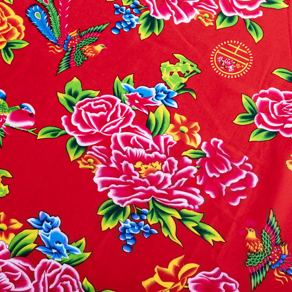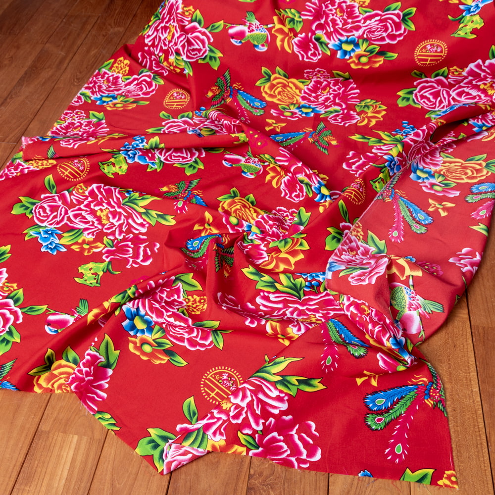 【3個セット】〔1m単位切り売り〕アジアのレトロ花柄ファブリック 生地 東北大花布 鳳凰牡丹 花鳥画 ヴィンテージ風 昭和レトロ〔約160cm〕 - レッド 通販店