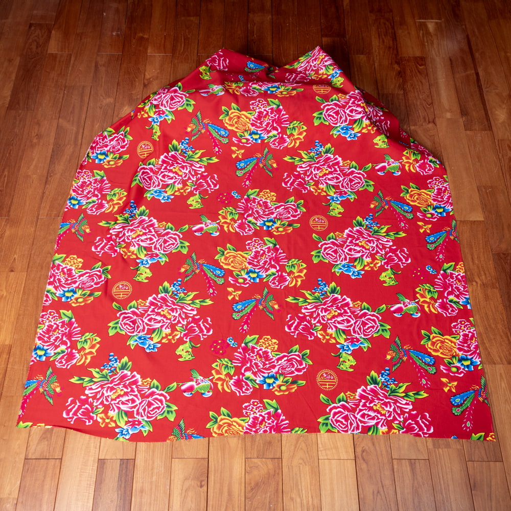 【3個セット】〔1m単位切り売り〕アジアのレトロ花柄ファブリック 生地 東北大花布 鳳凰牡丹 花鳥画 ヴィンテージ風 昭和レトロ〔約160cm〕 - レッド