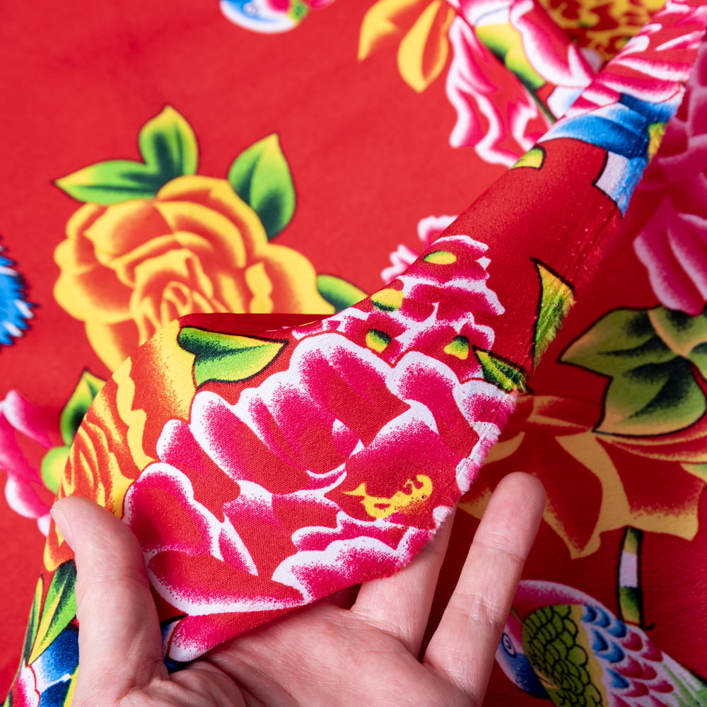 その後、上海の華東紡織管理局が設立され、大衆に好まれる生地の柄を作ることを呼びかけ、当時の中国のトップデザイナーたちが、東北大花布のデザインの原型を作り上げました。中でも「鳳凰牡丹」は有名で、不死鳥であり幸福や繁栄を表す鳳凰と、花王と呼ばれる牡丹の花が描かれています。花鳥画からの伝統を感じる、中国ならではの素敵なデザインですね。