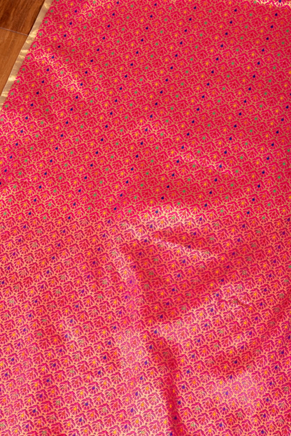 【3個セット】〔1m単位切り売り〕インドの伝統模様布 光沢感のあるブロケード生地 金糸〔約115cm〕ピンク系の商品写真 6枚目 陰影があるとこのような感じになります