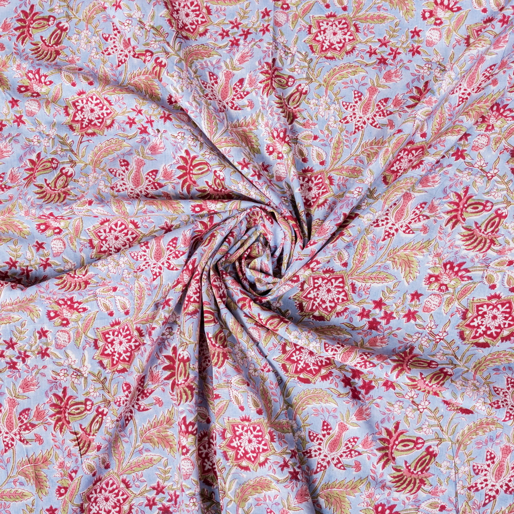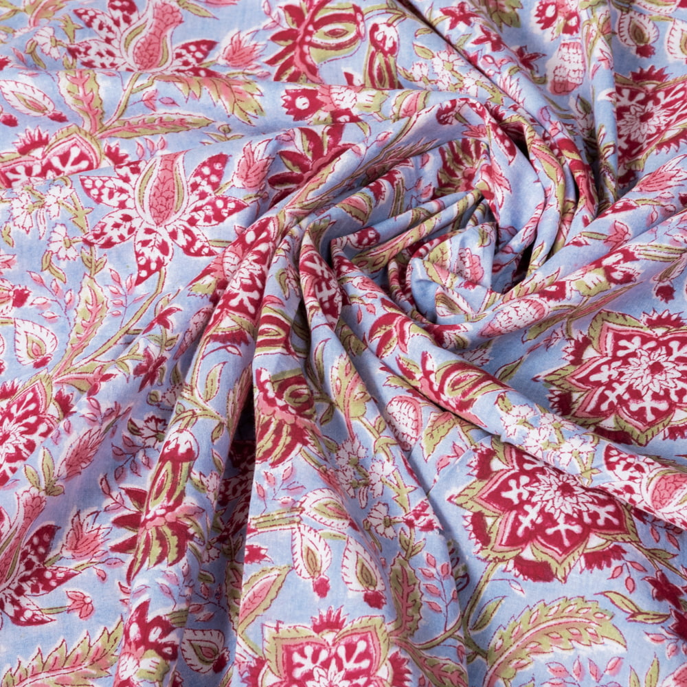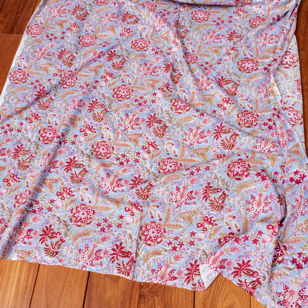 〔1m単位切り売り〕ジャイプル 職人手作り木版染め 色彩美しいボタニカルデザイン おしゃれ 生地 花柄 テーブルクロス 刺繍素材などへ〔幅約108cm〕 - サックスブルー系 x 3個