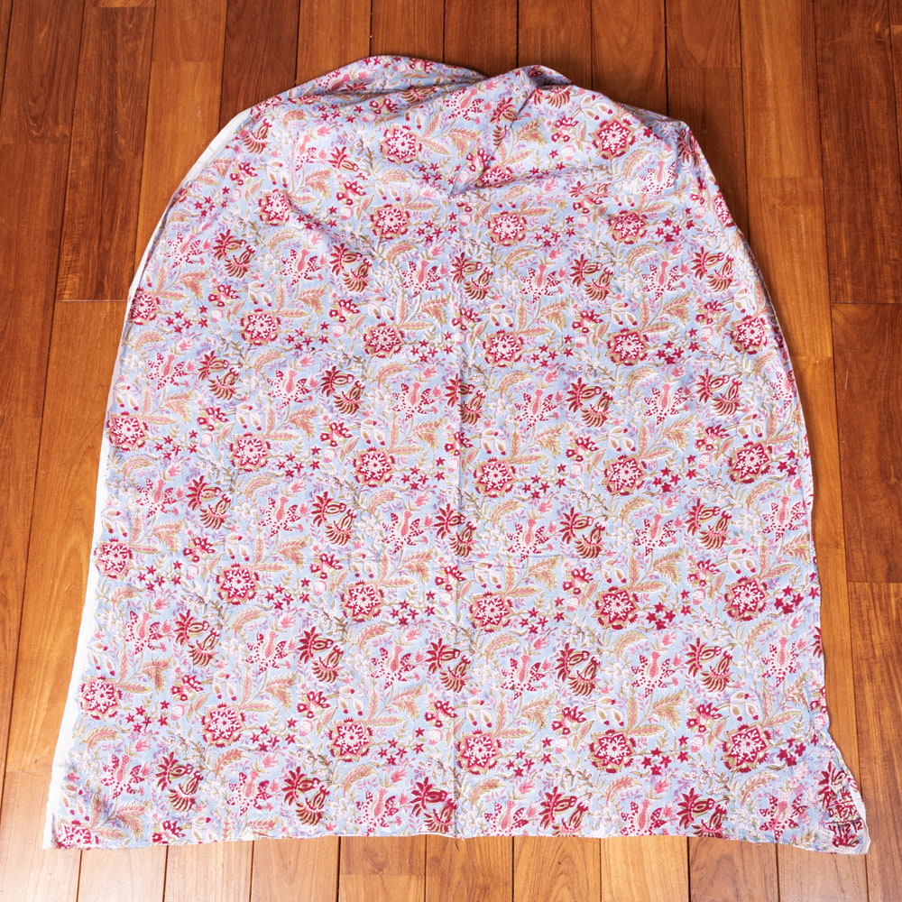 木版染めとは、ウッドブロック(木版)を用いて一つ一つ模様を染めこんだ優雅で贅沢な仕上がりの布です。大量生産には向かない、非常に時間のかかる丁寧な手仕事の賜物といえます。インドは美しい布の宝庫ですが、その中でも特に素敵な一枚に仕上がっています。ハンドメイドのウッドブロックプリントにしか出せない、独特のムラがありとても雰囲気があります。