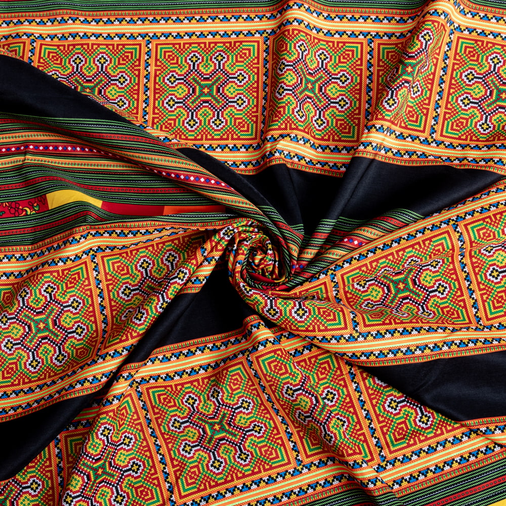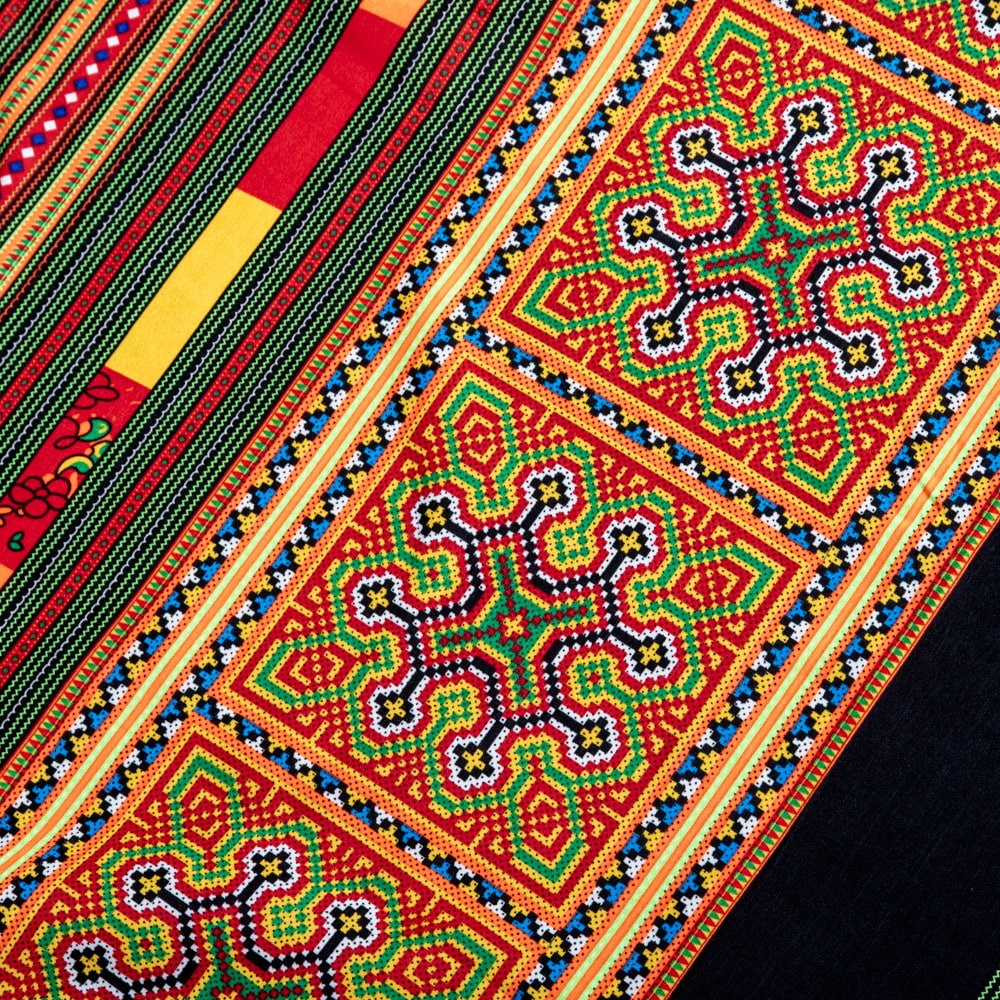 ベトナムの市場で見つけてきたモン族柄を、鮮やかにプリントした布です。ベトナムのモン族の伝統的な文化からインスパイアされた美しい柄と、昇華転写の技術が合わさっています。昇華転写プリントは、生地にインクを染み込ませる特殊な技術で、鮮やかな色彩と解像度の高さが魅力です。モン族の細かい刺繍の表現と、色鮮やかさの表現するのに適した手法ですね。ちょっと遠くからみると、結構リアルで刺繍風に見えます。