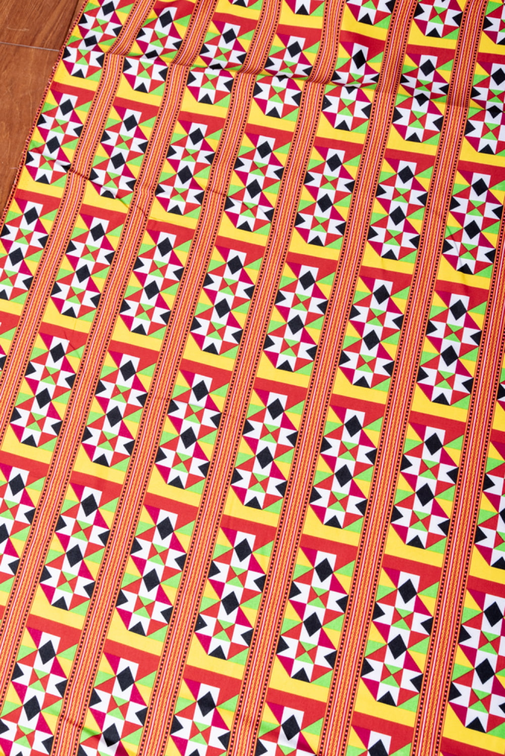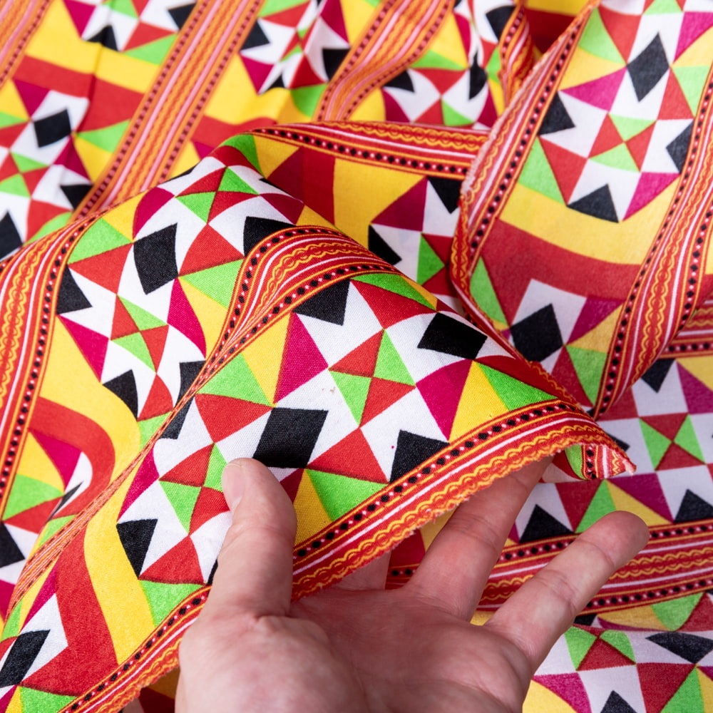ベトナムの市場で見つけてきた民族柄をプリントした布です。ベトナム周辺の山岳民族で用いられている物でしょうか?幾何学的な模様と、カラフルな色彩が良いですね。昇華転写で、発色が良くデザインが引き立っています。実際どこの民族の柄かは分かりませんが、テイストとしてはアフリカンファブリックのケンテ柄に似ているようにも思います。■様々な用途にお使いいただけます