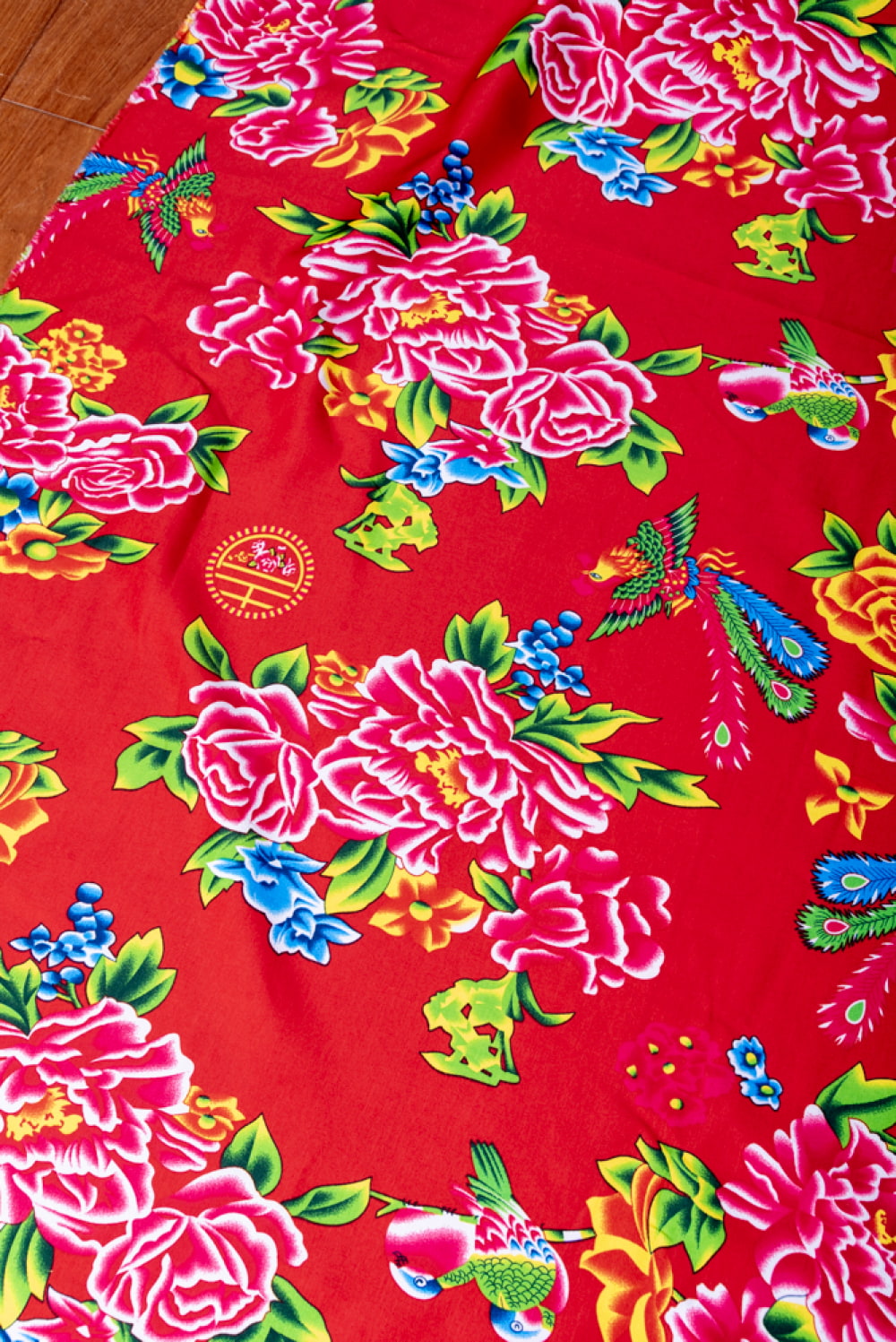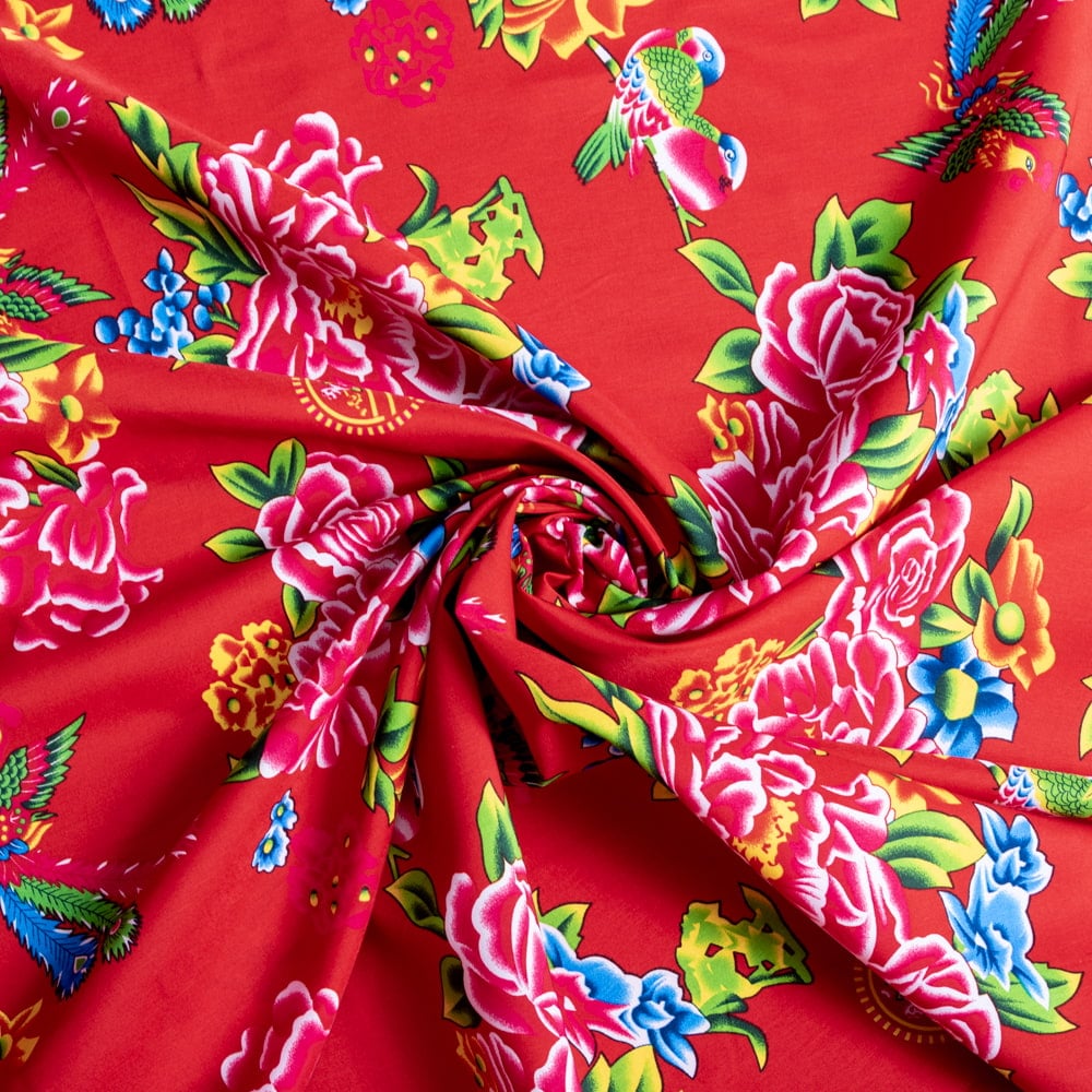 【5個セット】〔1m単位切り売り〕アジアのレトロ花柄ファブリック 生地 東北大花布 鳳凰牡丹 花鳥画 ヴィンテージ風 昭和レトロ〔約160cm〕 - レッド