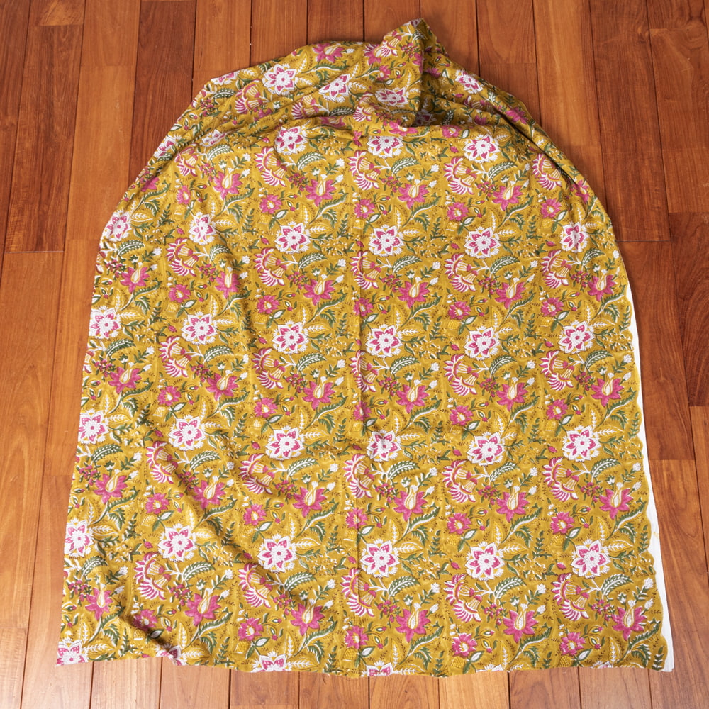 木版染めとは、ウッドブロック(木版)を用いて一つ一つ模様を染めこんだ優雅で贅沢な仕上がりの布です。大量生産には向かない、非常に時間のかかる丁寧な手仕事の賜物といえます。インドは美しい布の宝庫ですが、その中でも特に素敵な一枚に仕上がっています。ハンドメイドのウッドブロックプリントにしか出せない、独特のムラがありとても雰囲気があります。