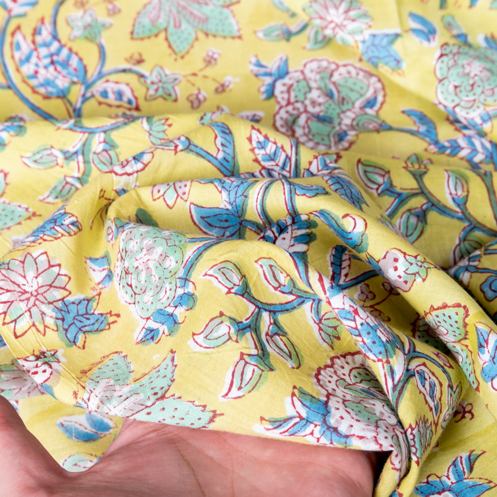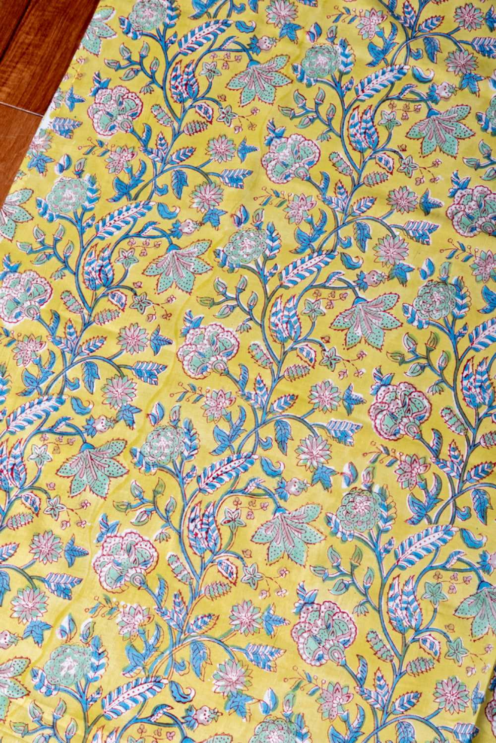 【5個セット】〔1m切単位り売り〕ジャイプル 職人手作り木版染め 色彩美しいボタニカルデザイン おしゃれ 生地 花柄 テーブルクロス 刺繍素材などへ〔幅約111cm〕 - ウグイス系