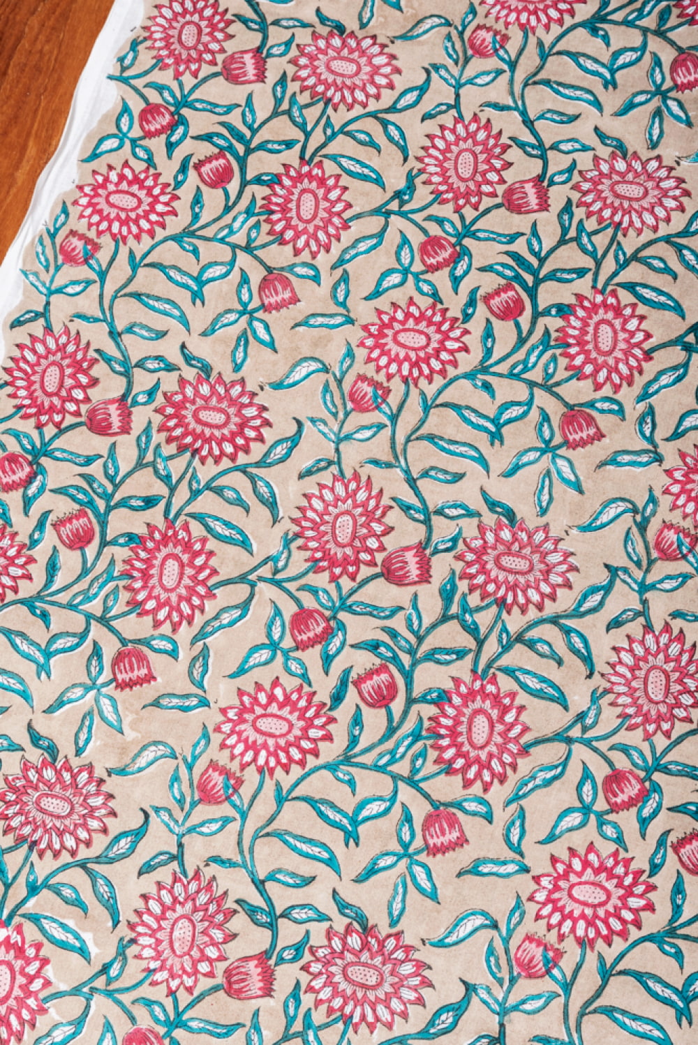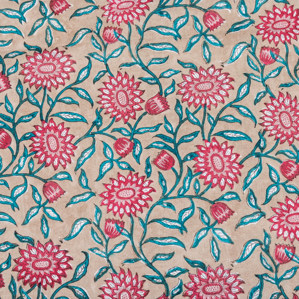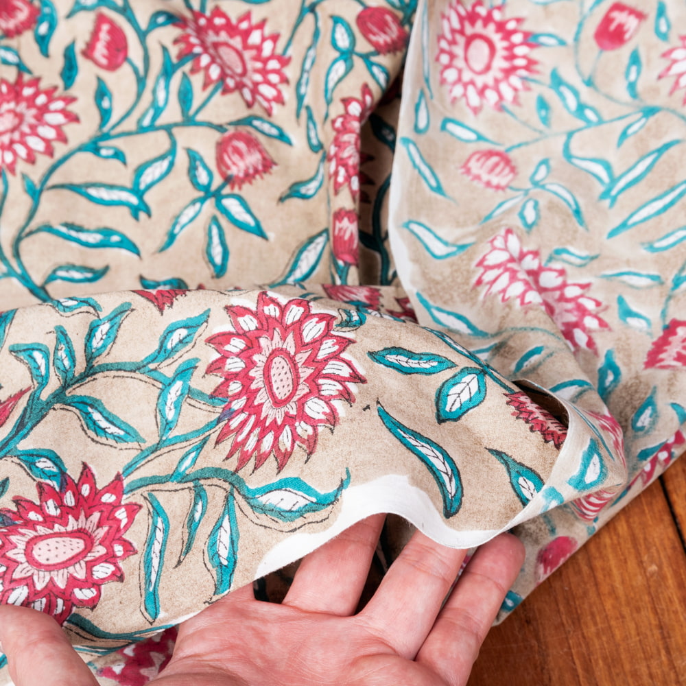 とってもかわいい生地がジャイプルからやってきました。どこかプロヴァンスなテイストも感じさせる、魅力的な色彩とデザイン。職人さんが全て手作りしており、インドらしい木版と鮮やかな色彩がきわだつ、インド綿100%のファブリックです。ナチュラルな風合いは、派手すぎずほどよく上品な雰囲気で、どんなお部屋にも馴染み、相性良くフィットしてくれそうです。