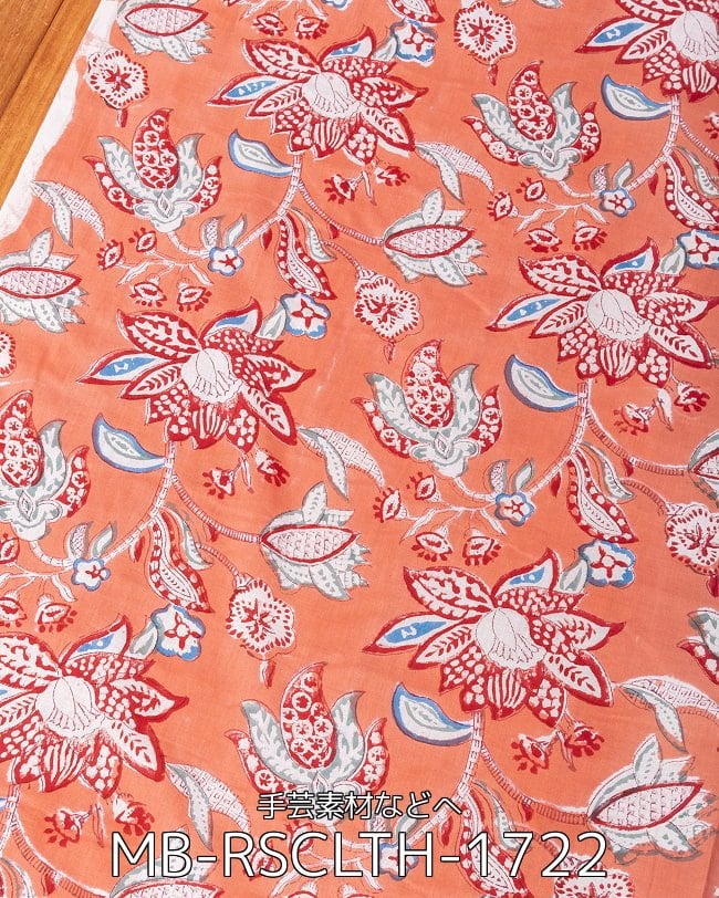【3個セット】〔1m単位切り売り〕ジャイプル 職人手作り木版染め 色彩美しいボタニカルデザイン〔幅約109cm〕〔サーモンオレンジ系 更紗柄〕 おしゃれ 生地 テーブルクロス 手芸素材などへ