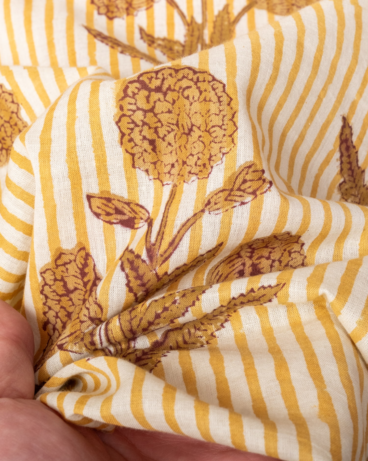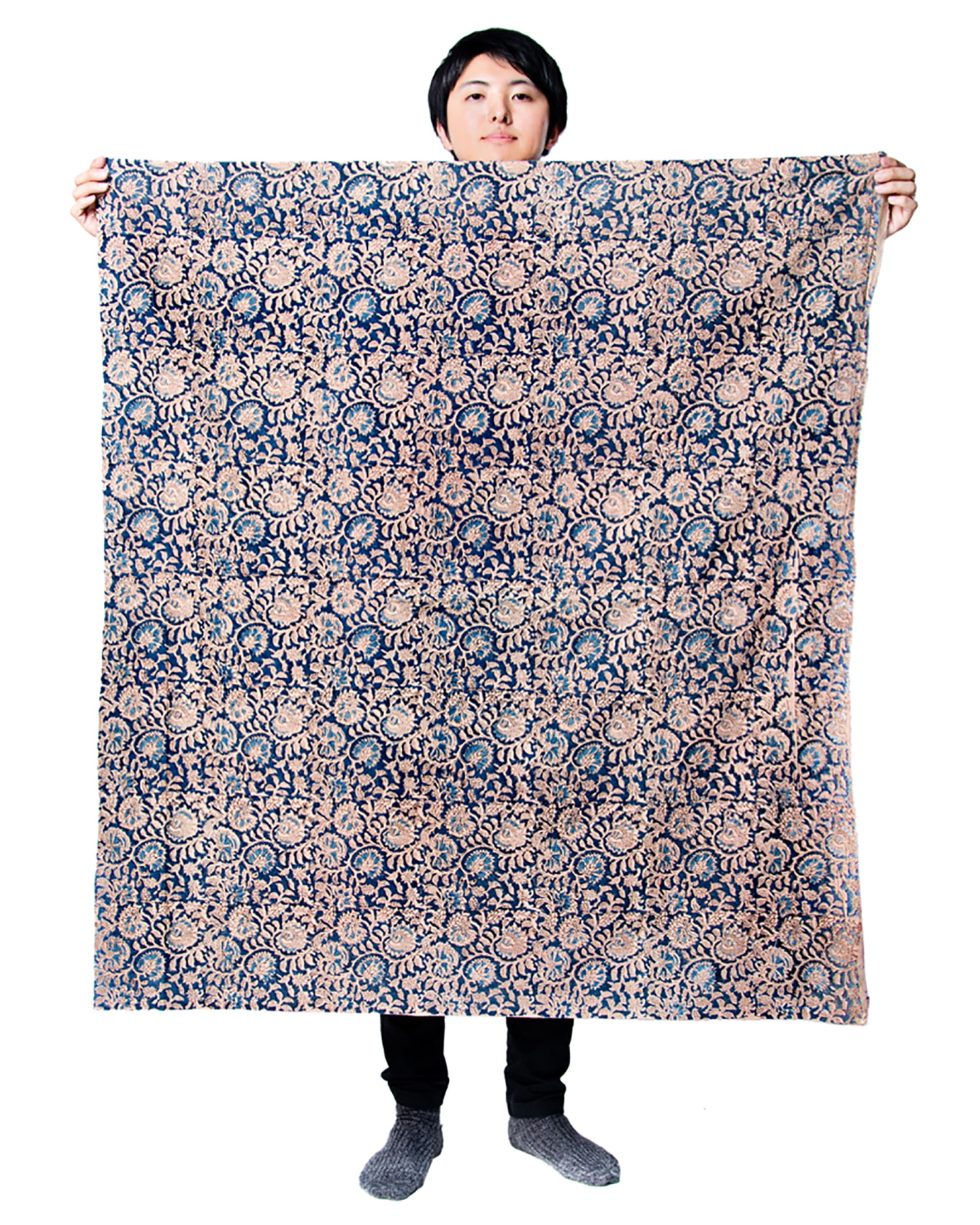 木版染めとは、ウッドブロック(木版)を用いて一つ一つ模様を染めこんだ優雅で贅沢な仕上がりの布です。大量生産には向かない、非常に時間のかかる丁寧な手仕事の賜物といえます。インドは美しい布の宝庫ですが、その中でも特に素敵な一枚に仕上がっています。ハンドメイドのウッドブロックプリントにしか出せない、独特のムラがありとても雰囲気があります。
