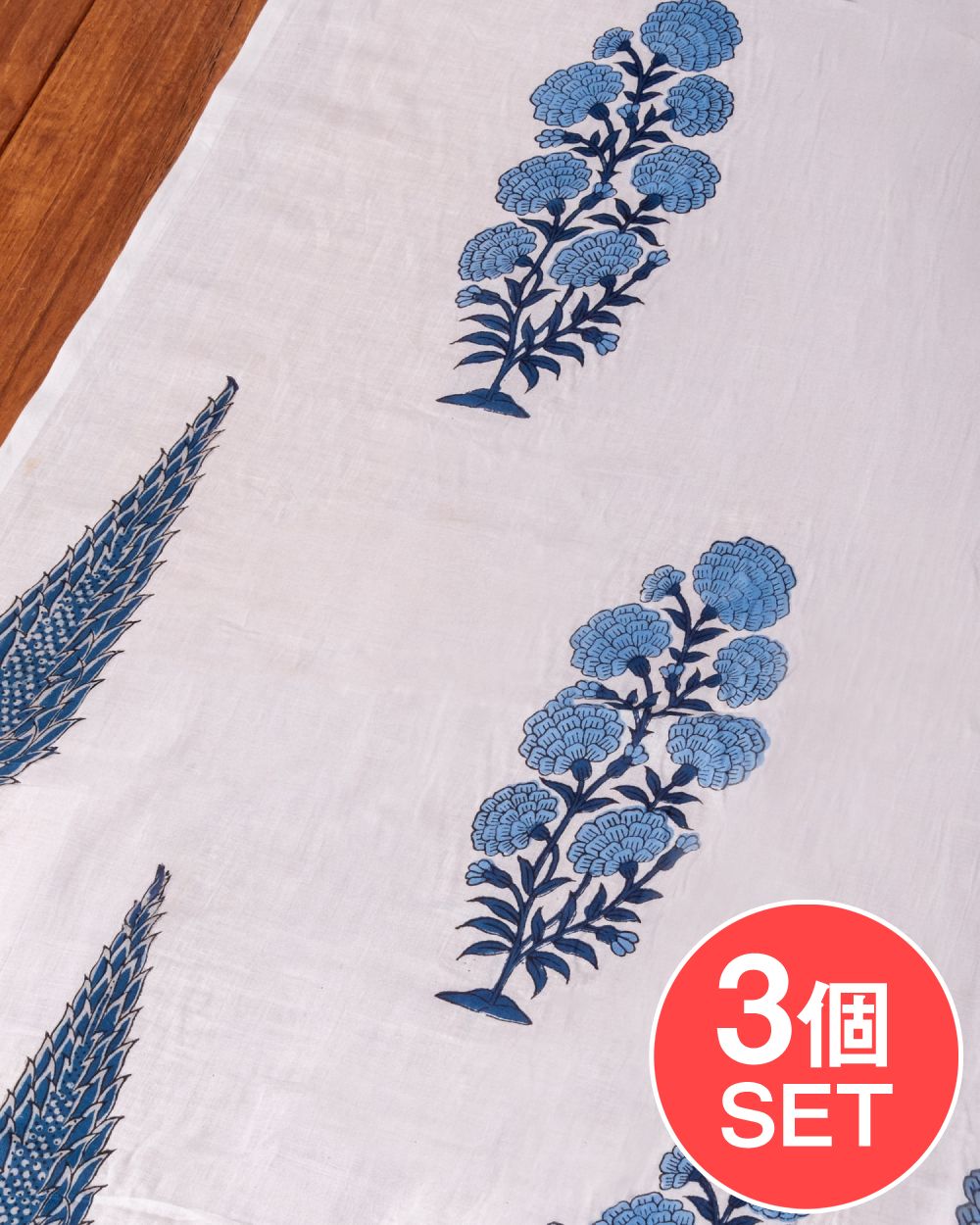 【3個セット】〔1m単位切り売り〕ジャイプル 職人手作り木版染め 色彩美しいボタニカルデザイン〔幅約110cm〕〔白×青系 植物柄〕 おしゃれ 生地 テーブルクロス 手芸素材などへ
