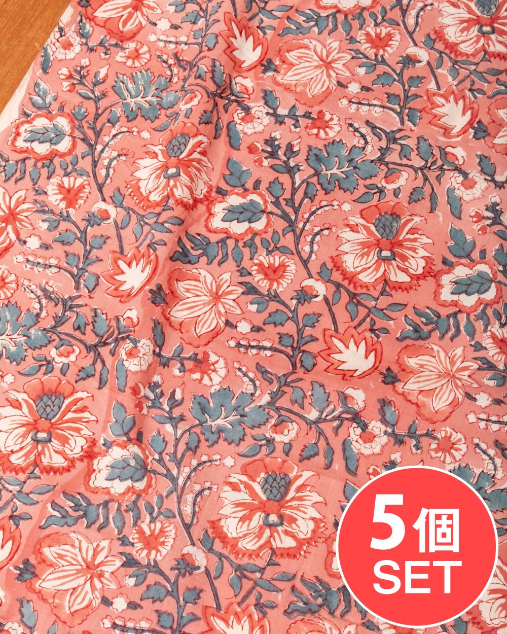 〔1m単位切り売り〕ジャイプル 職人手作り木版染め 色彩美しいボタニカルデザイン〔幅約109cm〕〔サーモンオレンジ系 更紗柄〕 おしゃれ 生地 テーブルクロス 手芸素材などへ x 5個