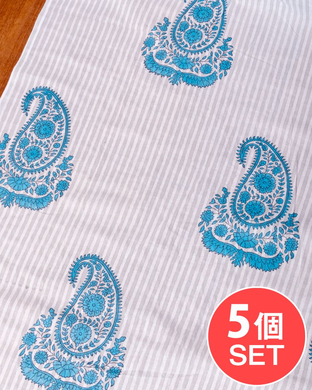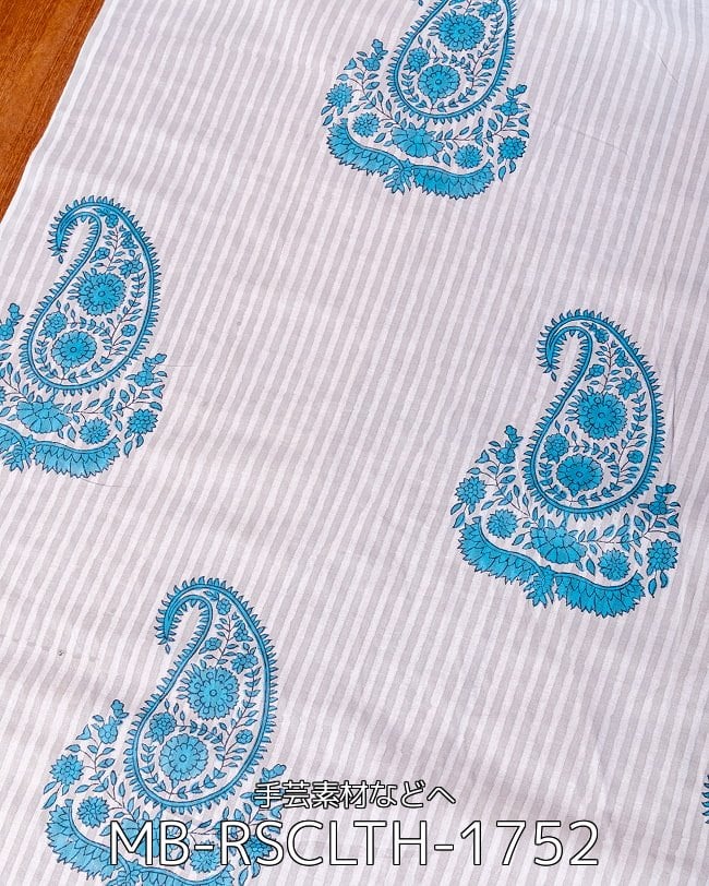 【5個セット】〔1m単位切り売り〕ジャイプル 職人手作り木版染め 色彩美しいボタニカルデザイン〔幅約109cm〕〔白×グレー×青系 ストライプペイズリー〕 おしゃれ 生地 テーブルクロス 手芸素材などの同一カテゴリ商品