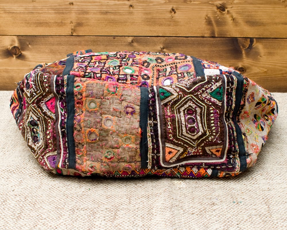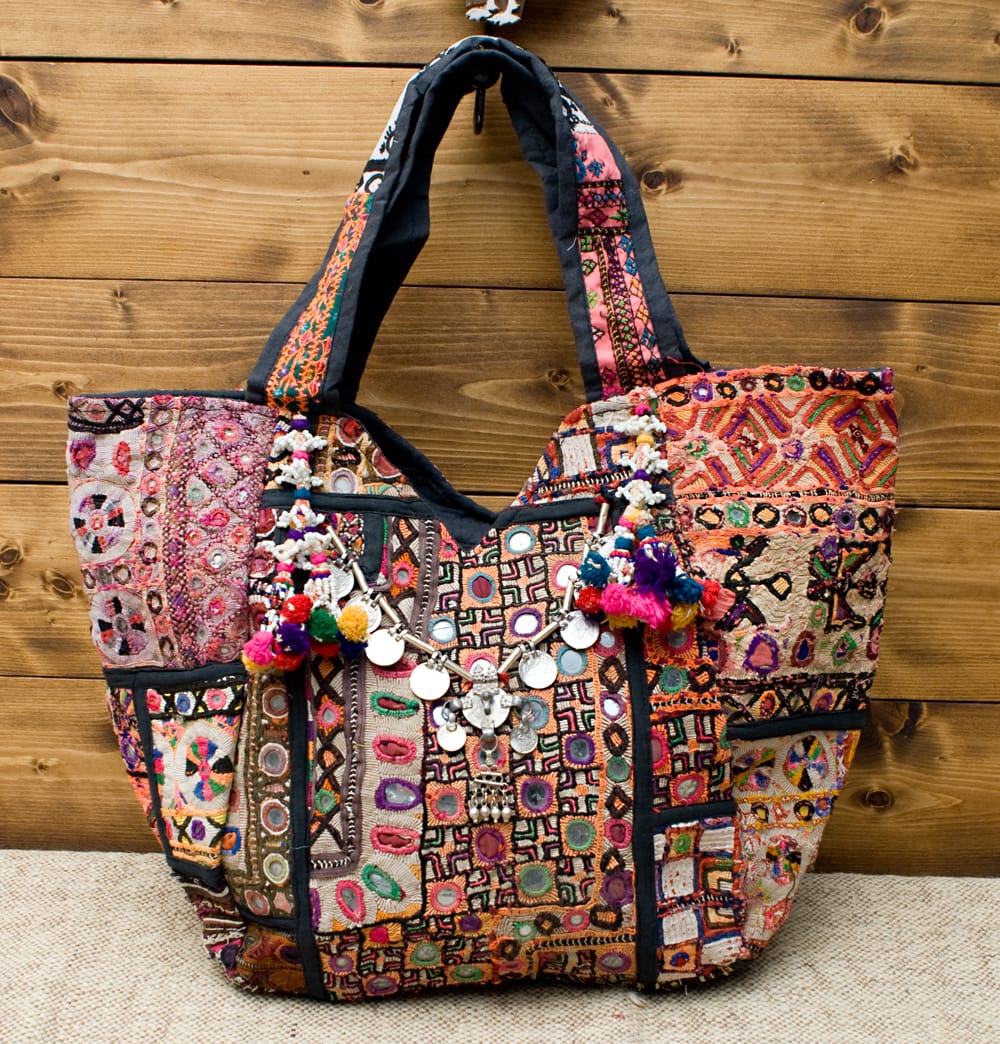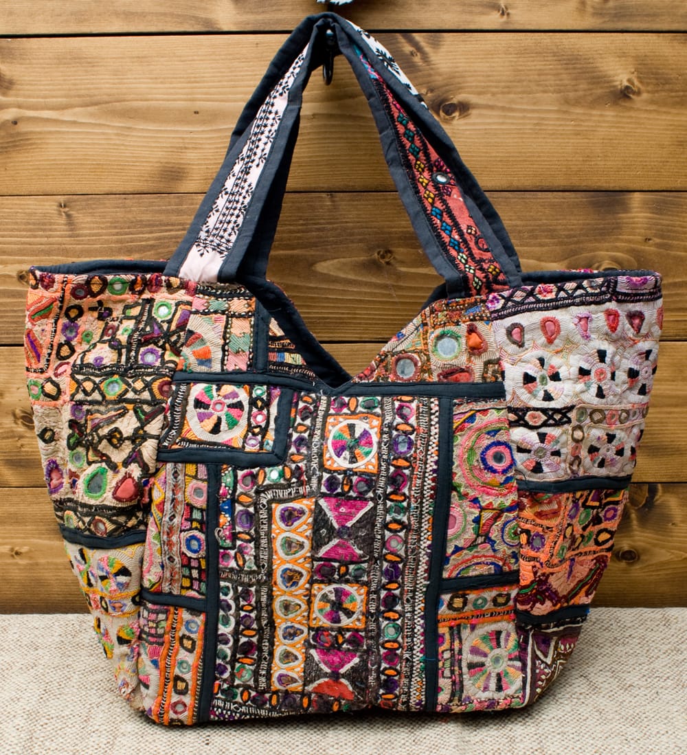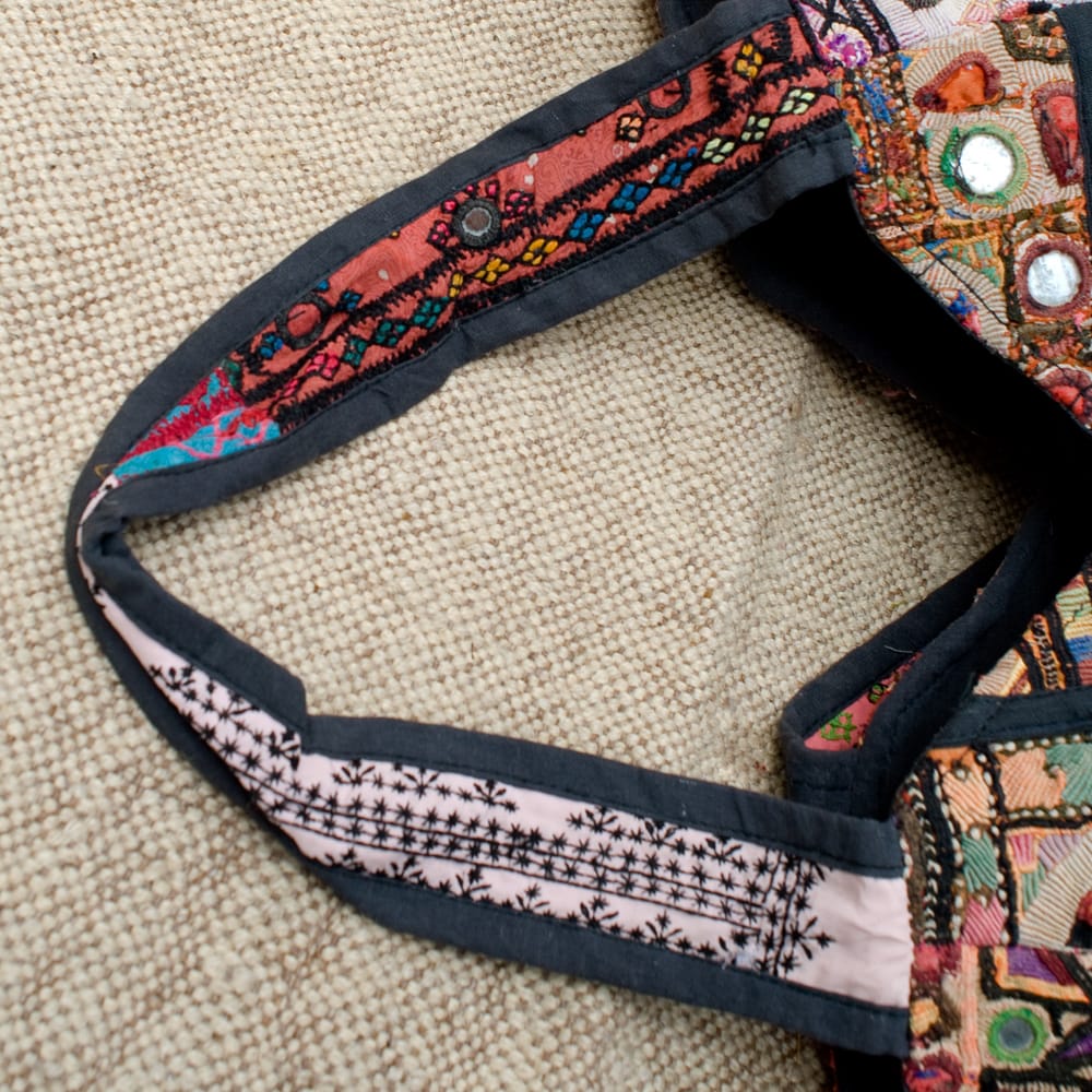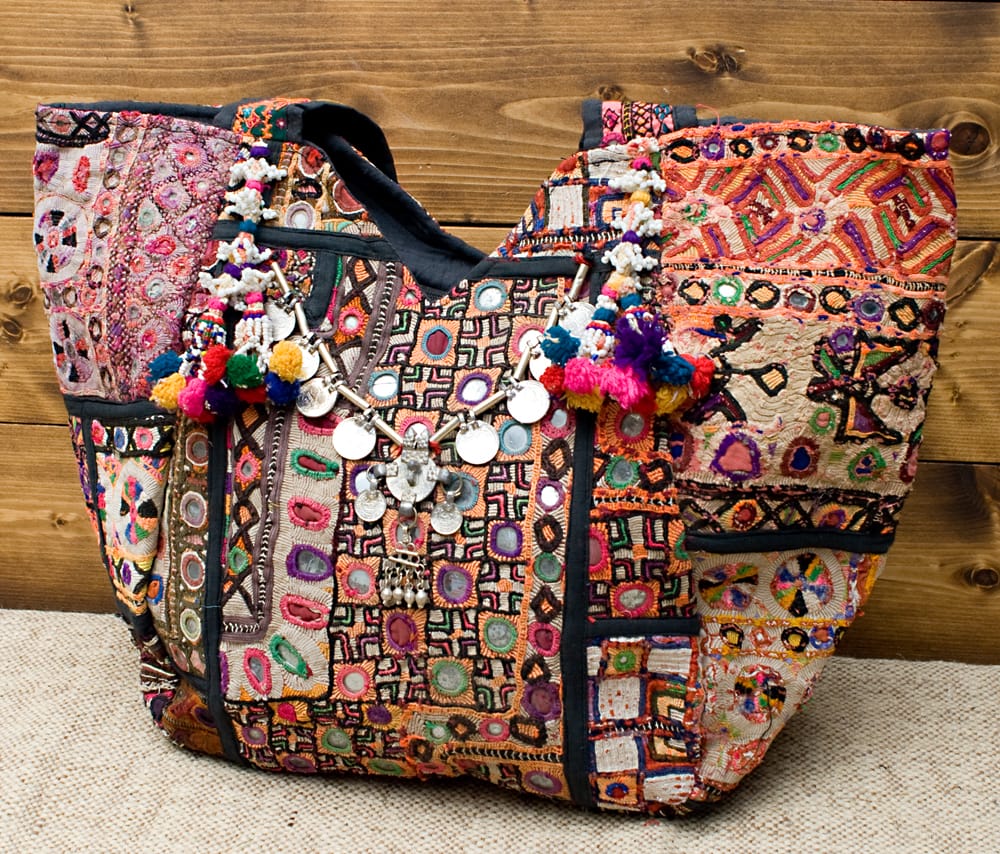 古布を1枚1枚配置し、パッチワークのようにつなぎ合わせたバッグです。色鮮やかなカラフルな布地に、ビーズやミラーワークがほどこされていたりと、存在感たっぷりのバッグです。古布が1枚1枚職人の手によって合わさり、バッグに生まれ変わる・・・その配色は世界にひとつだけ。