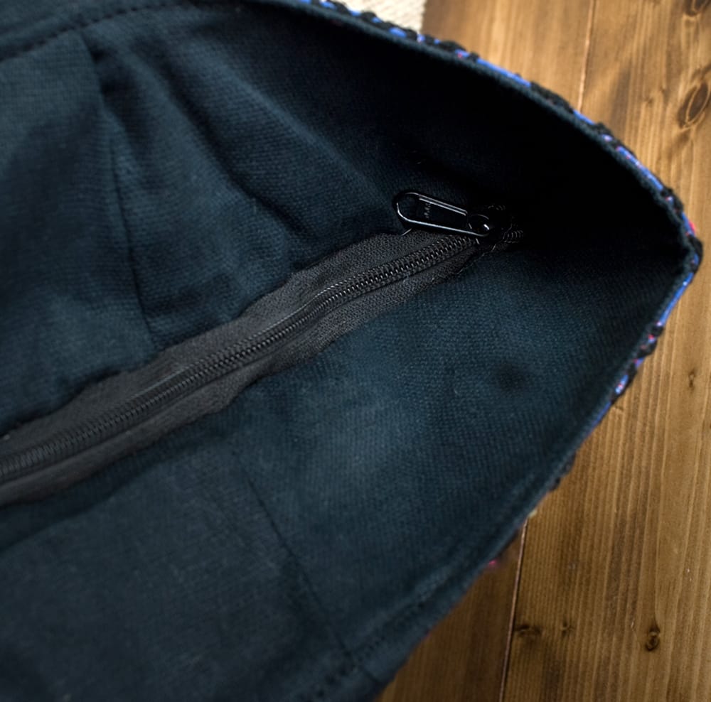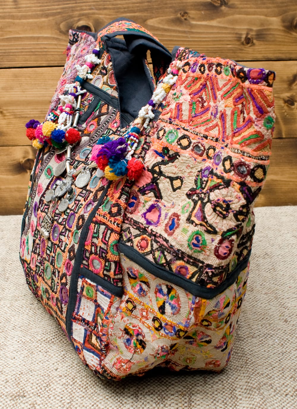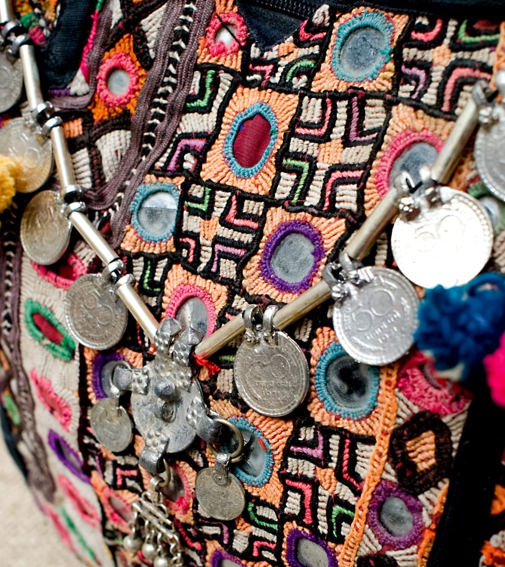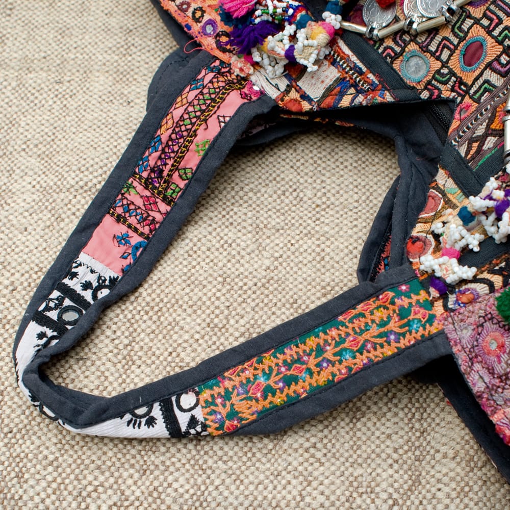古布を1枚1枚配置し、パッチワークのようにつなぎ合わせたバッグです。色鮮やかなカラフルな布地に、ビーズやミラーワークがほどこされていたりと、存在感たっぷりのバッグです。古布が1枚1枚職人の手によって合わさり、バッグに生まれ変わる・・・その配色は世界にひとつだけ。
