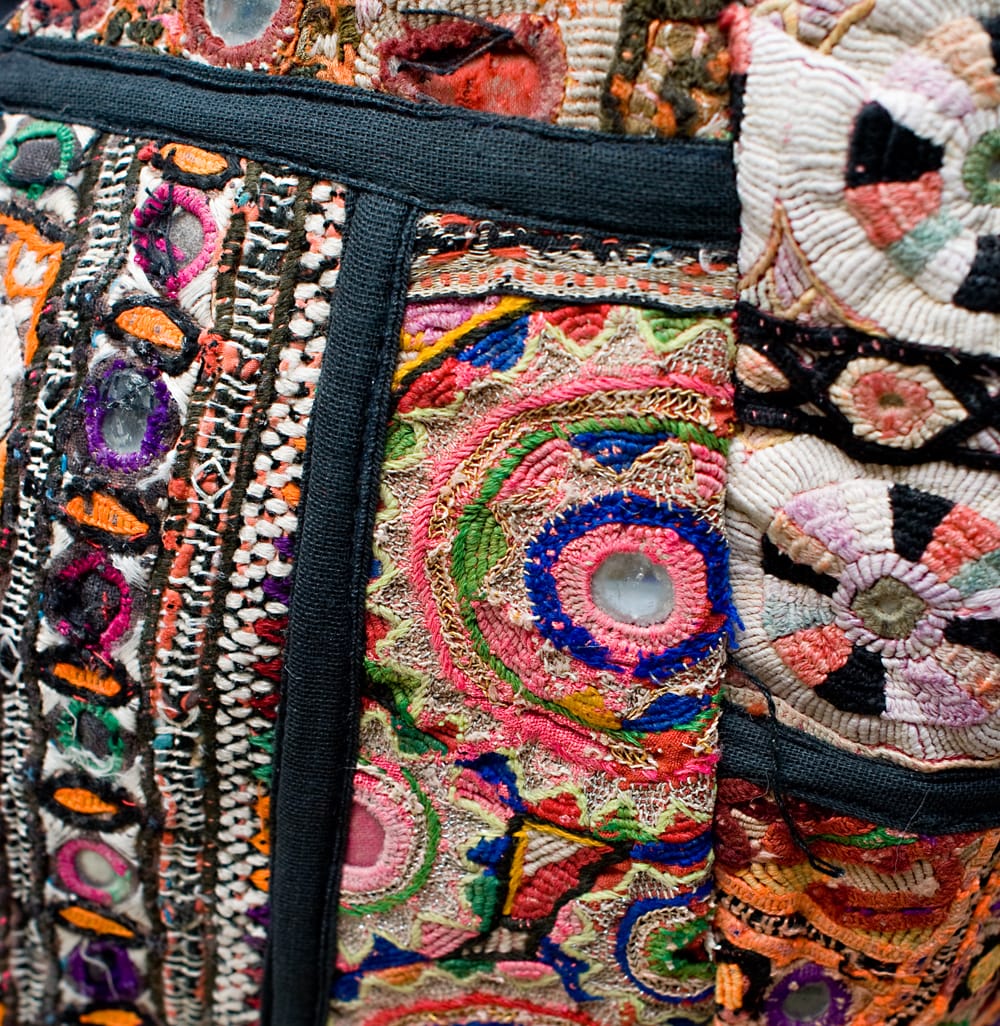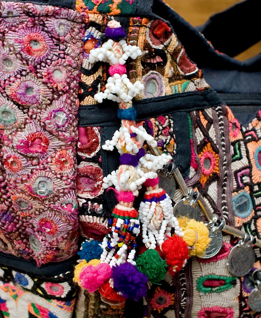 使用している生地は、中央アジアと南アジアの交差点からやって来た古布です。もう着なくなった民族衣装や装飾品の一部を切り取り、予め用意しておいた型紙に合わせて、布を貼りあわせていきます。まったく別々の雰囲気を醸し出していた古布たちがひとつの型紙に貼り合わされると、まるで初めからそうであったかのように、ピッタリと独特の雰囲気で収まるから不思議。