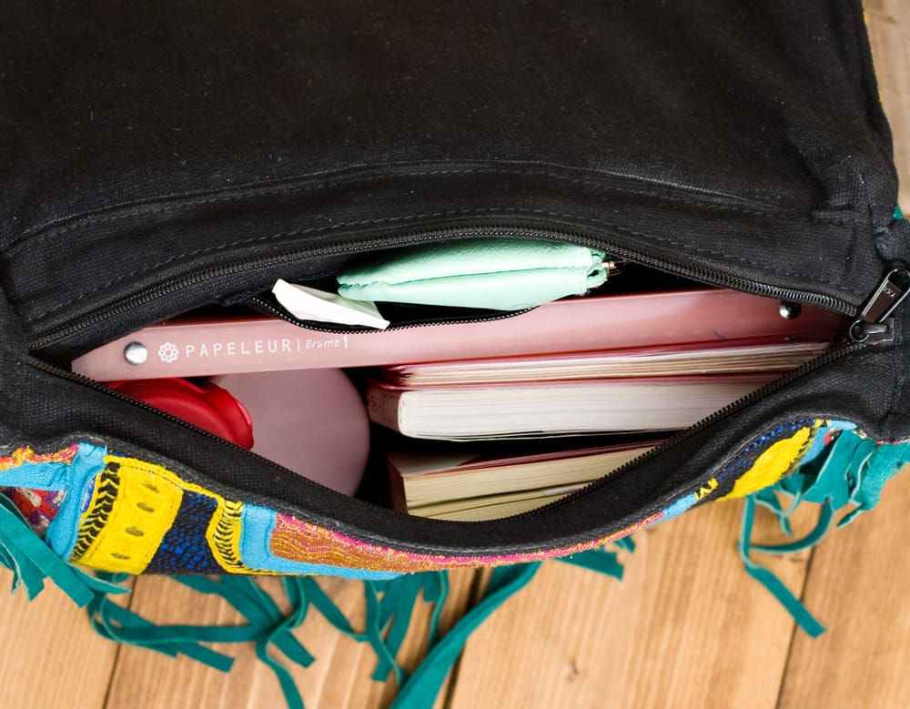 しっかりとしたスウェードのレザー生地に色鮮やかな美しい刺繍が印象的なバッグです。IPADやB5ファイル、水筒等、意外と沢山入ってとても使いやすいサイズです!