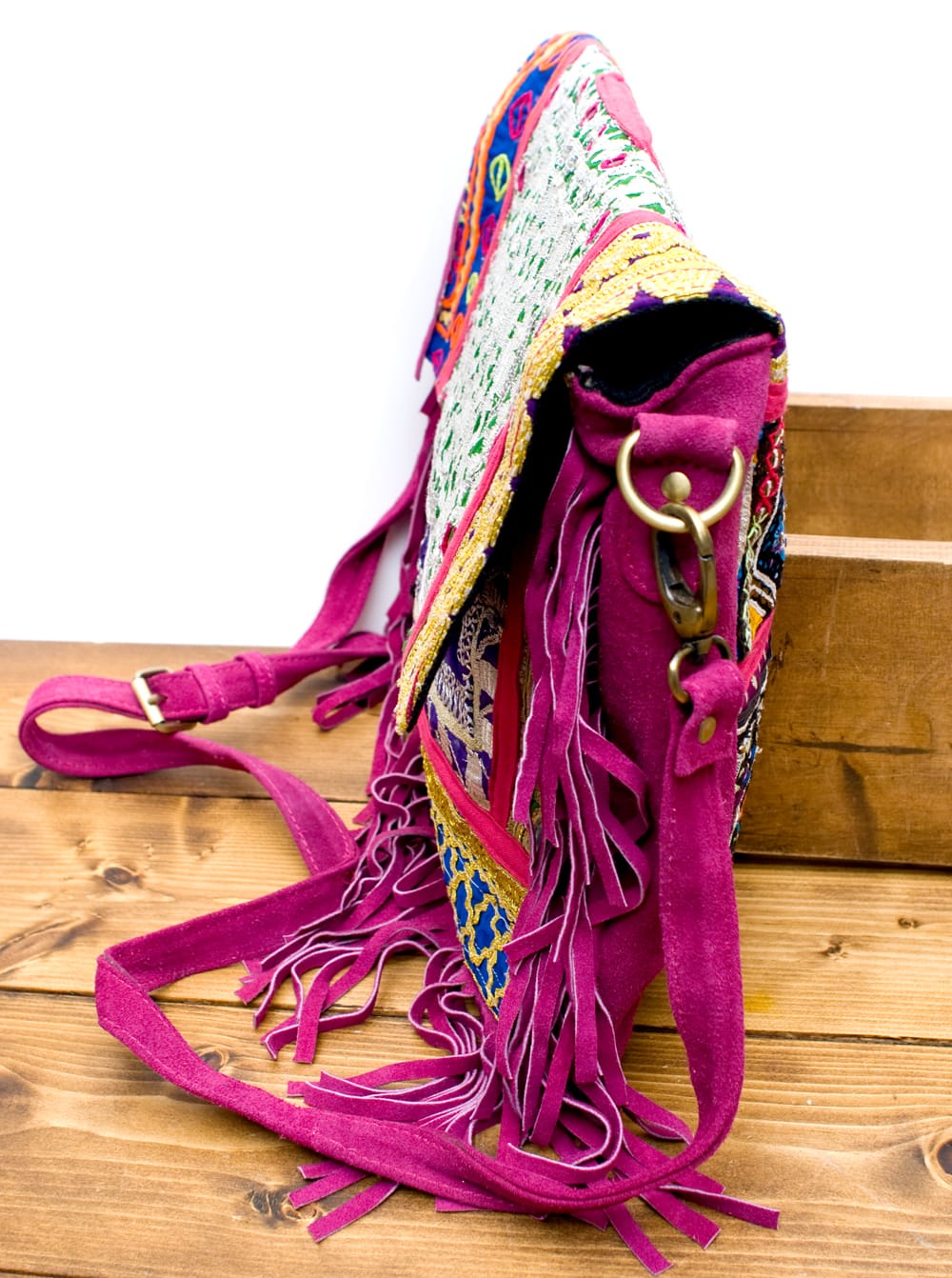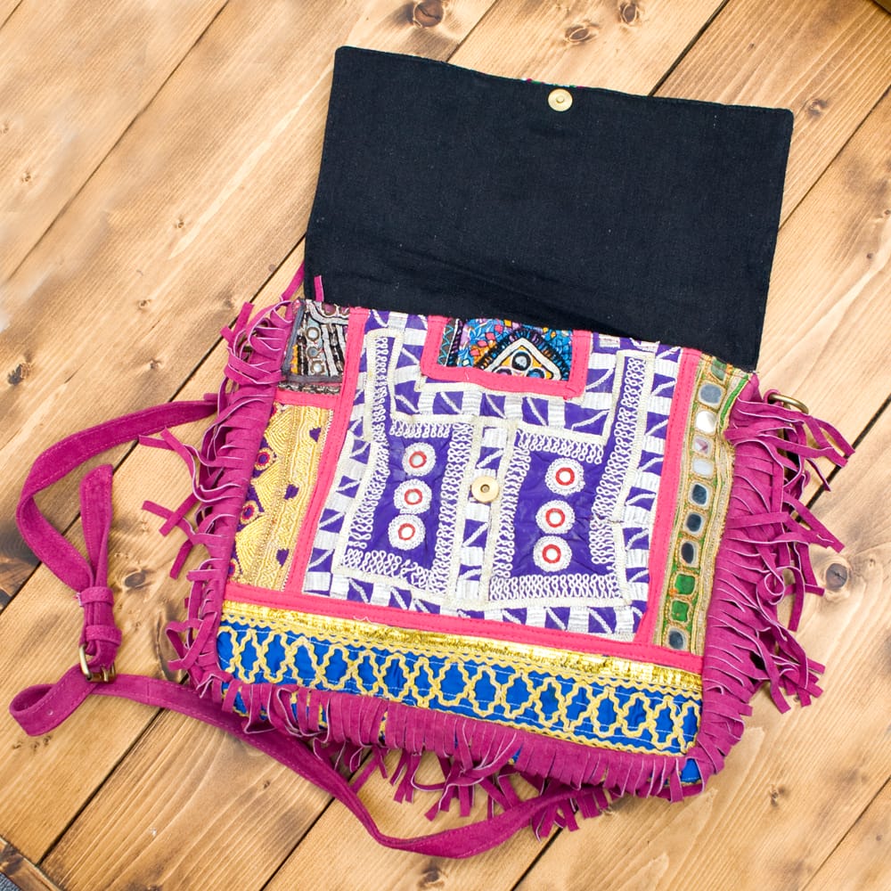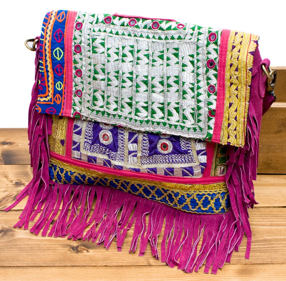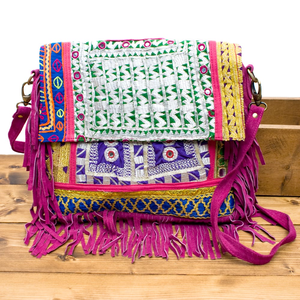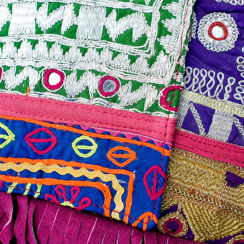 古布を1枚1枚配置し、パッチワークのようにつなぎ合わせたバッグです。色鮮やかなカラフルな布地に、ビーズやミラーワークがほどこされていたりと、存在感たっぷりのバッグです。古布が1枚1枚職人の手によって合わさり、バッグに生まれ変わる・・・その配色は世界にひとつだけ。