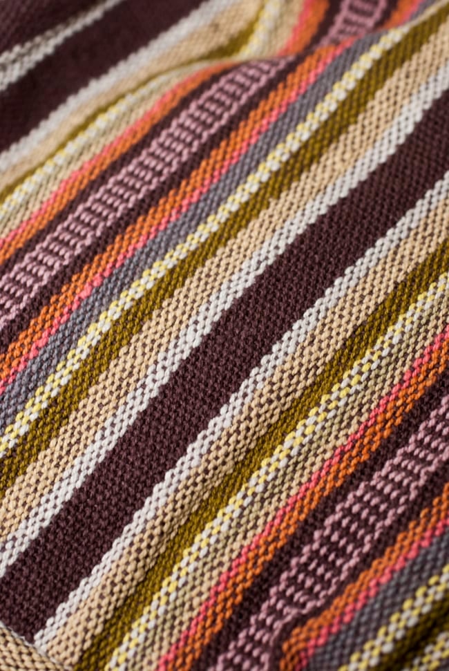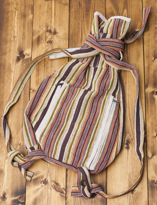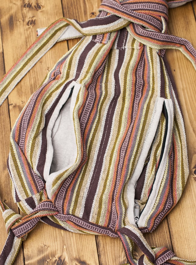 このバッグの布地はゲリと呼ばれる、ネパール独自の生地が使われています。カラフルなこの生地は、ネパールの人たちが自分たちが好きな色合いで作っているもので、太めの糸で織られた温かみのある風合いです。ちょっと粗めの生地ですのでワイルドな雰囲気にもピッタリです。■背中のジップが便利です