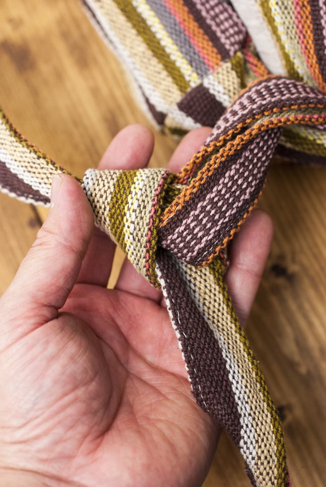 肩紐の長さは、ご自分で結んで調整するタイプです。身長や体格に合わせて調整可能なので、自分にフィットできて使いやすいです。