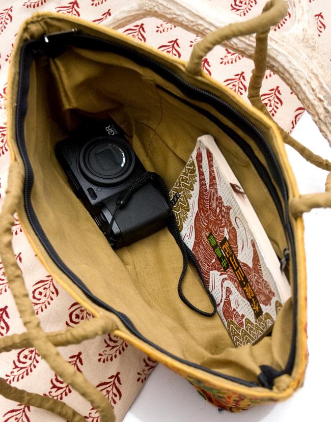 女性が持つのにぴったりなサイズ。携帯にノート、身の回りに必要なものを入れて歩くことが出来る大きさです。インド製品は、見えにくい部分で手を抜かれてしまうことがあるのですが、こちらは底のマチ部分もしっかりとしていて、中もちゃんと綺麗です。更に、中には内ポケットまで付いていて、とっても実用的な作りになっております。使う人のことを考えながら、手間をかけて作られたバッグだと思います。なお、この商品は手作りの刺繍物ですので、それぞれ模様などが異なります。どちらもかわいいので、おすすめです。
