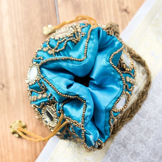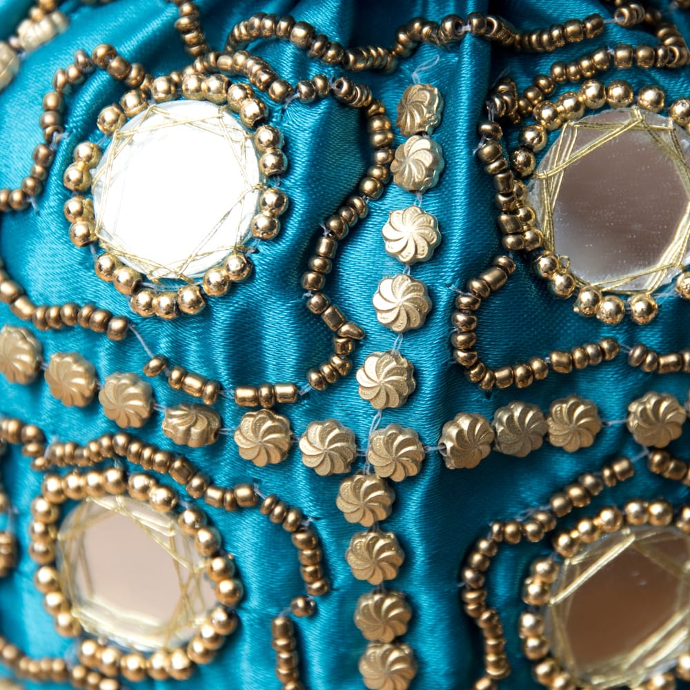 華やかなゴールドビーズ&ミラーワークの巾着ミニポーチ ミニバッグ - 水色 通販店