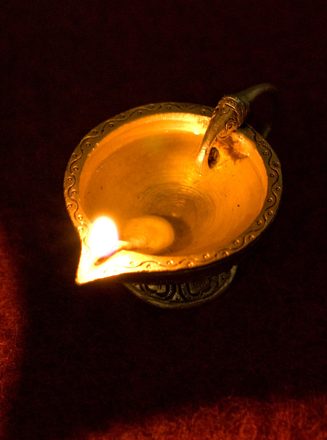 インドではギーと言う油を入れて灯すオイルランプが伝統的に使われてきました。くぼんだ部分に油を入れ、コットンをひねって灯心を作って灯します。この牛のオイルランプはインド古来からの伝統と、牛が身近にいる生活習慣を表現したとても素敵な一品。インドの農村で特別なオイルランプとして使われてきた歴史が想像できますね。通常のオイルランプはコットンの灯心を支える部分がないので、しばしば灯心が油の中に入り込み、消えてしまうのですが、このオイルランプだと牛の口からひねった灯心を出す事ができるので、その心配がありません。