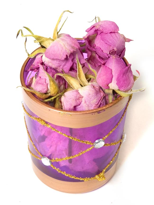 色鮮やかなグラスにシルバーやゴールドのラメで模様が描かれたキャンドルグラスです。シルバーやゴールドの模様が、妖艶な雰囲気を醸しだしてくれます。こちらのスタンドにろくそくを灯せば、一気に温かい光りに包まれて、素敵な空間のお部屋にしてくれること間違いなしです。■オリエンタルな小物いれとして