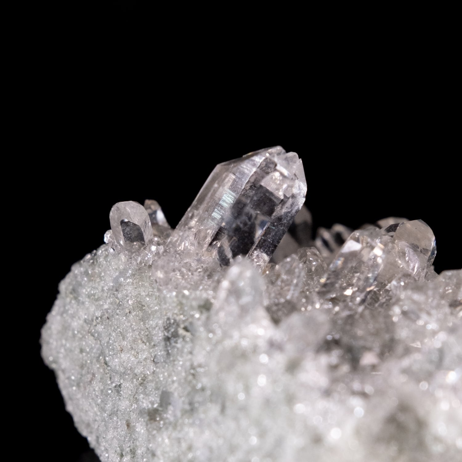 ・多様な表情: 緑色のクローライト(緑泥石)、黒色のアナテース(鋭錐石)、金色のルチル(金紅石)などが含まれる、個性豊かな結晶が見られます。