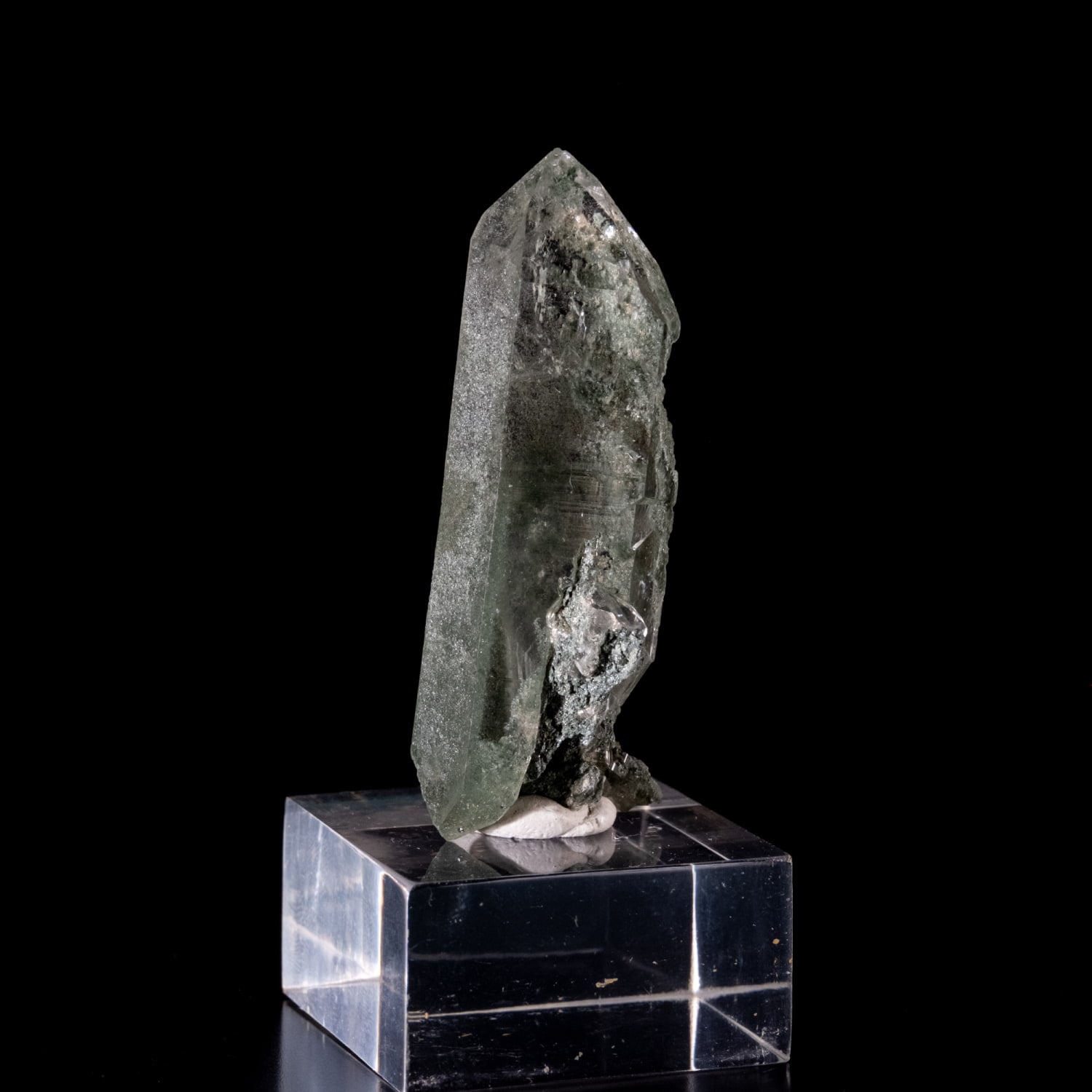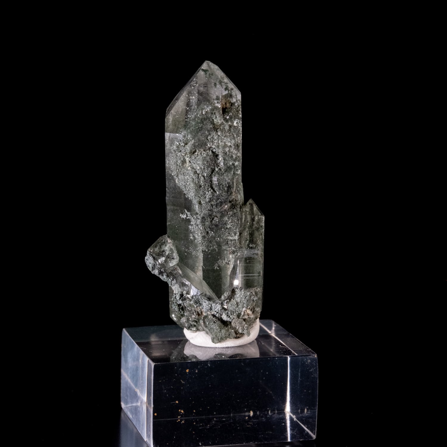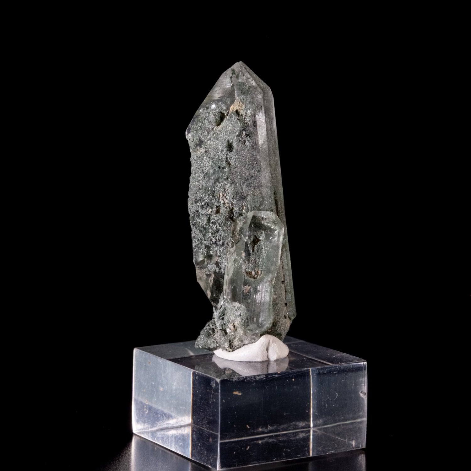 抜群に透明度の高いポイントにクローライトが付着し、ガーデン状に内包されているのも確認出来ます。バーコード状の模様も見られ、寄り添うように付いた小さいポイントはタビーと言われる形をした先端をしていて、眺めているだけで時を忘れてしまいます。