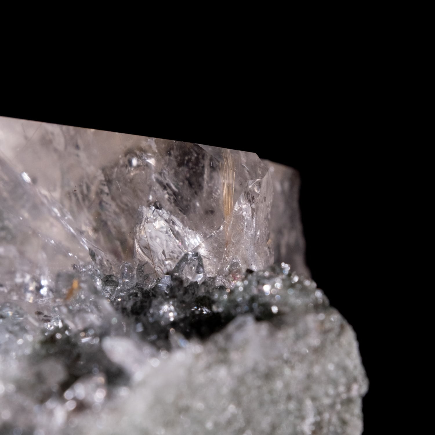 ・多様な表情: 緑色のクローライト(緑泥石)、黒色のアナテース(鋭錐石)、金色のルチル(金紅石)などが含まれる、個性豊かな結晶が見られます。