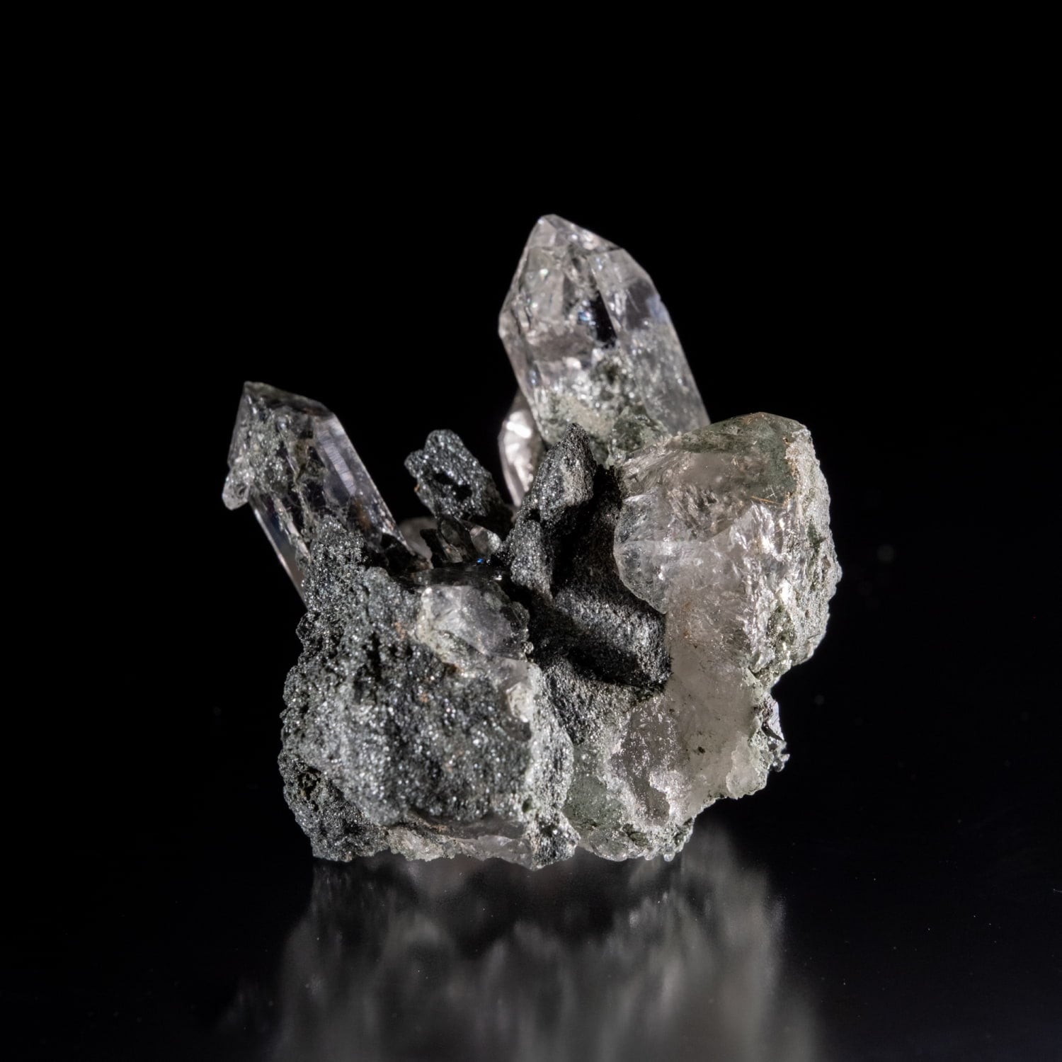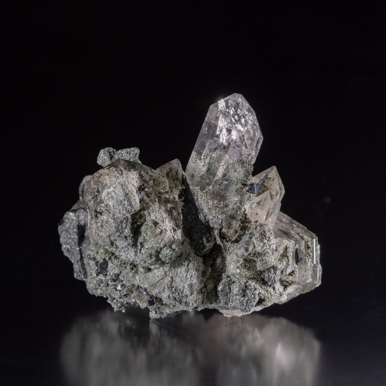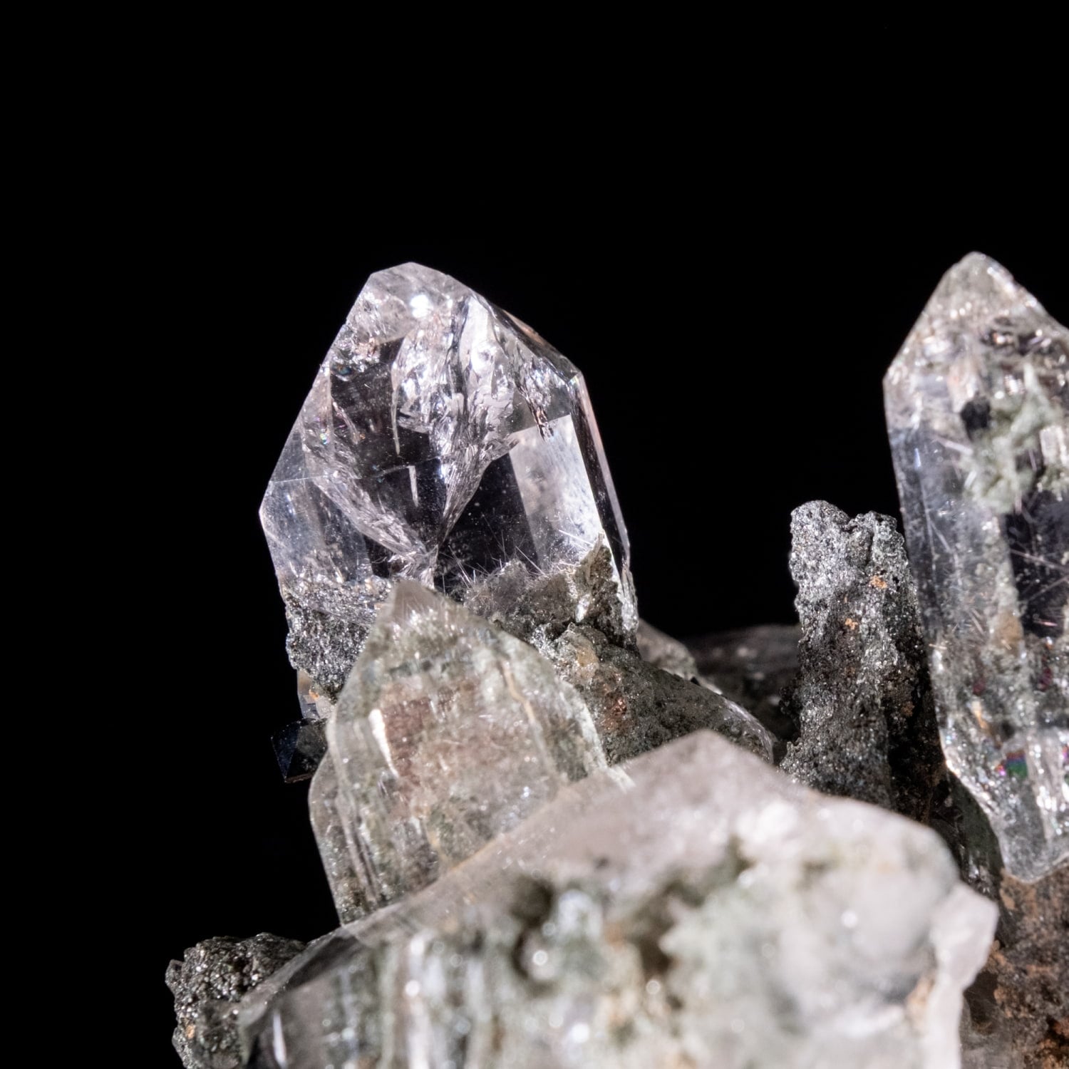 ・多様な表情: 緑色のクローライト(緑泥石)、黒色のアナテース(鋭錐石)、金色のルチル(金紅石)などが含まれる、個性豊かな結晶が見られます。