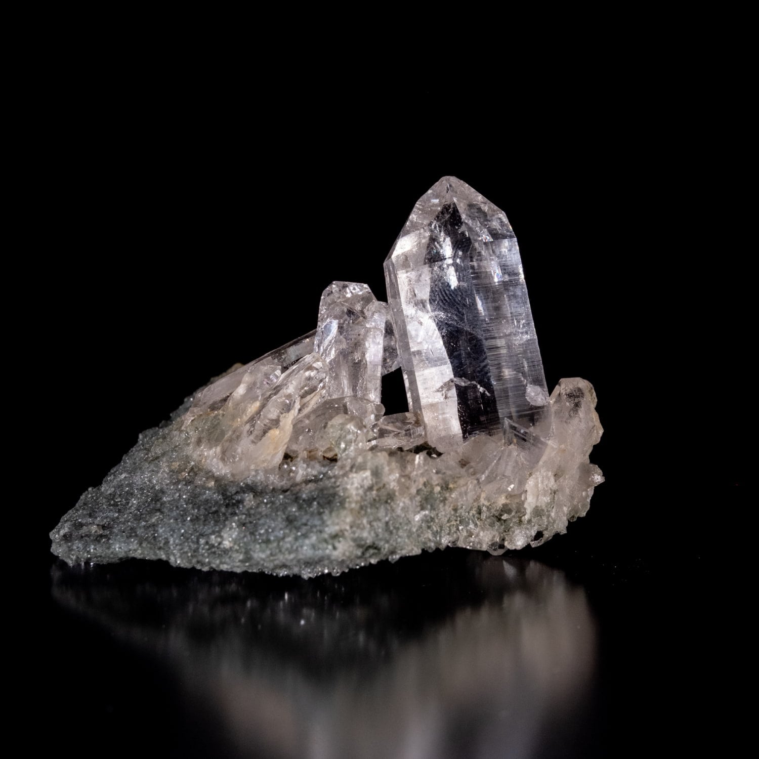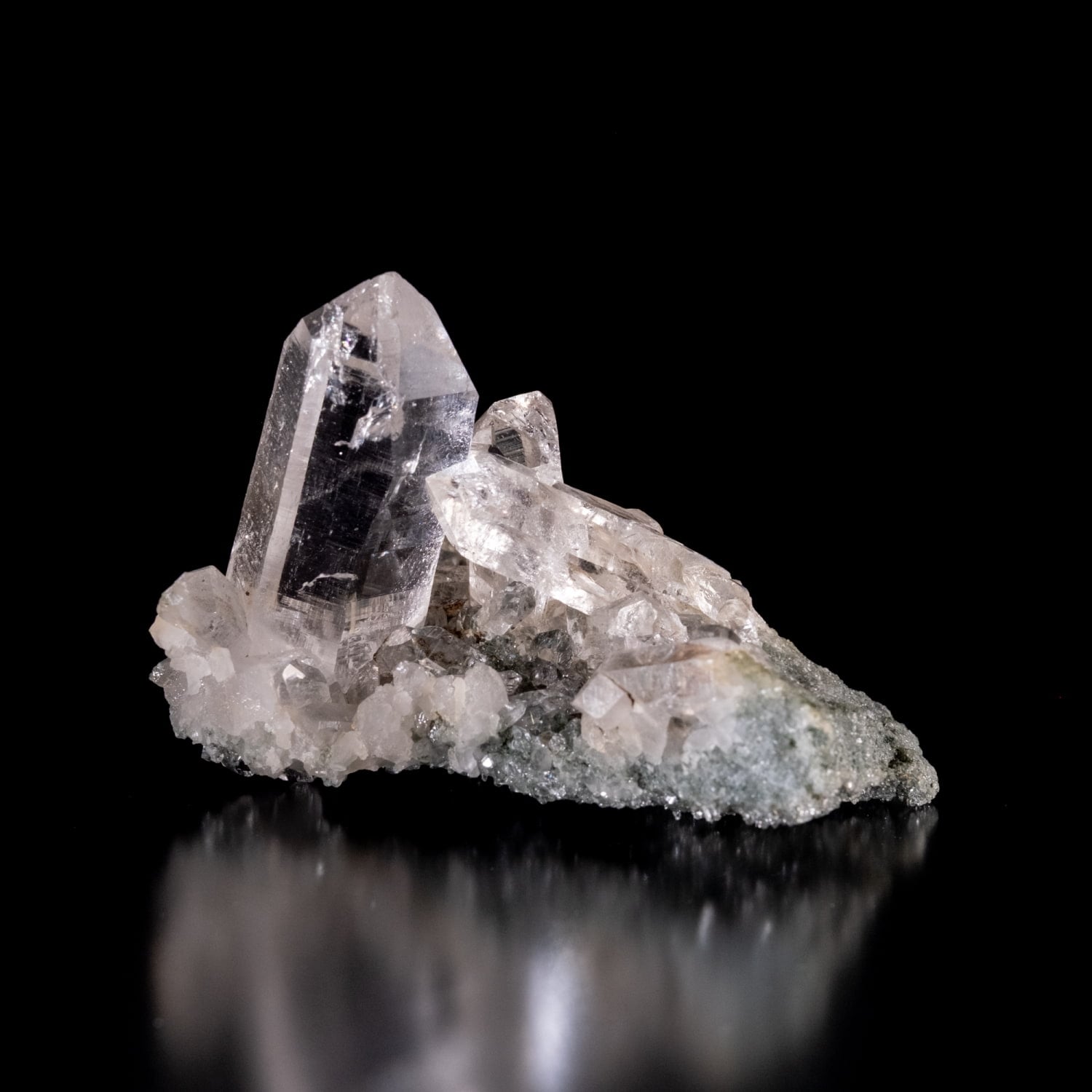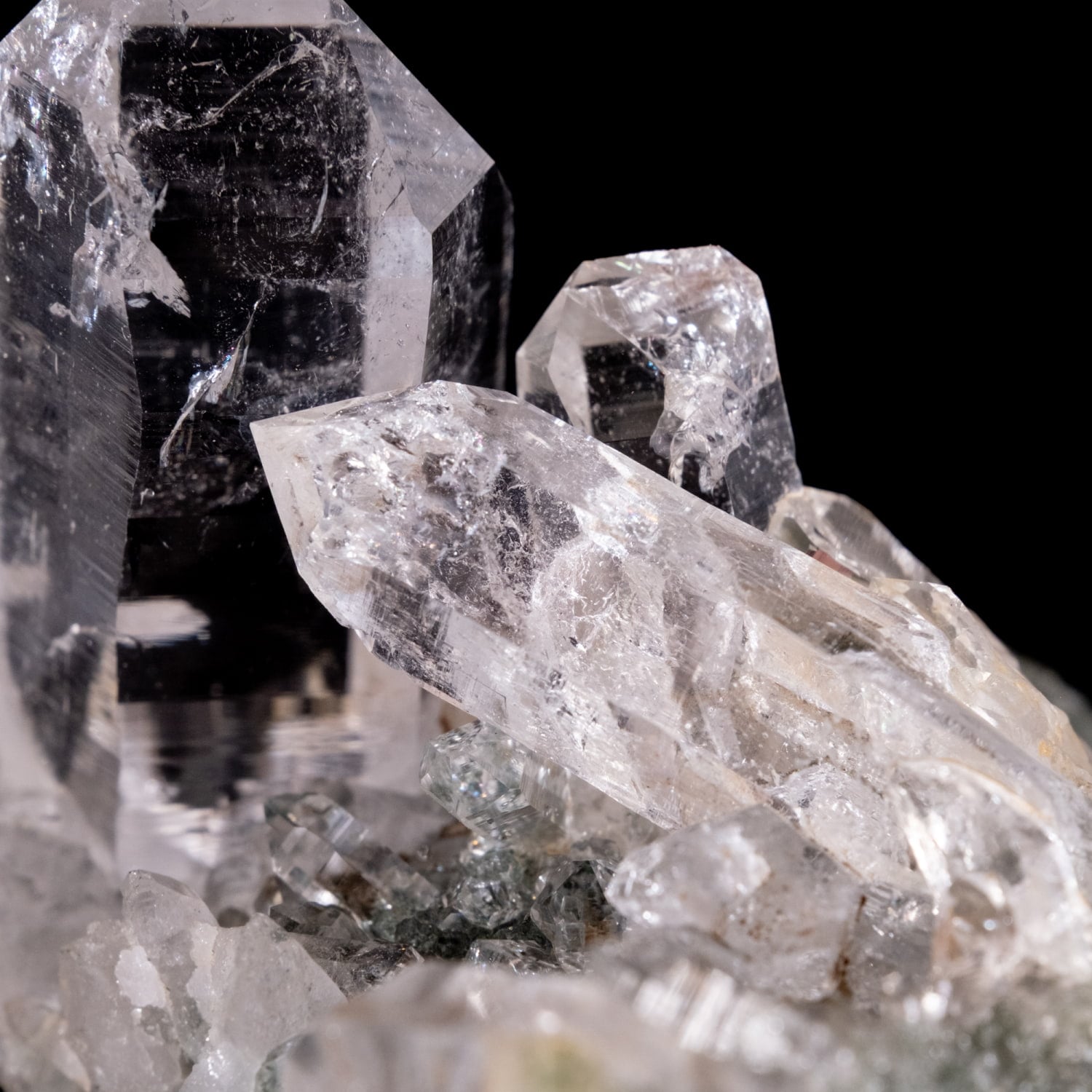 ・多様な表情: 緑色のクローライト(緑泥石)、黒色のアナテース(鋭錐石)、金色のルチル(金紅石)などが含まれる、個性豊かな結晶が見られます。