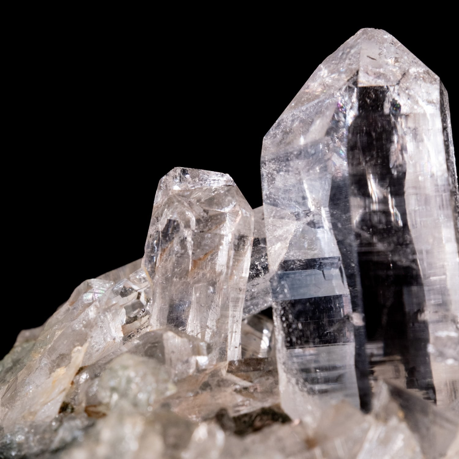 透明度が抜群で結晶が太目の存在感のあるクラスターです。タビーと言われる形をした先端にレシーバーと言われる七角形の面にバーコード状の模様も見られ、角度によってはレインボーも確認出来ます。