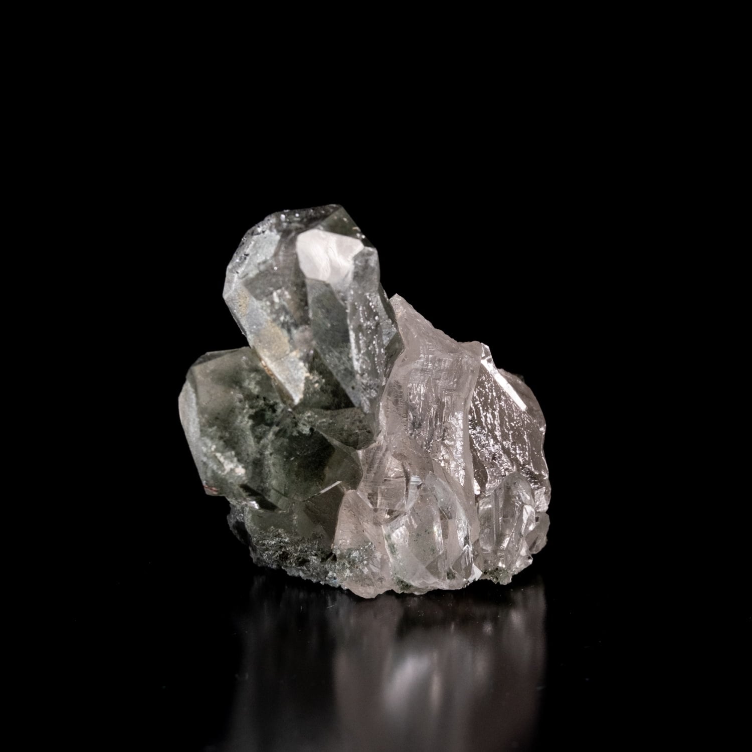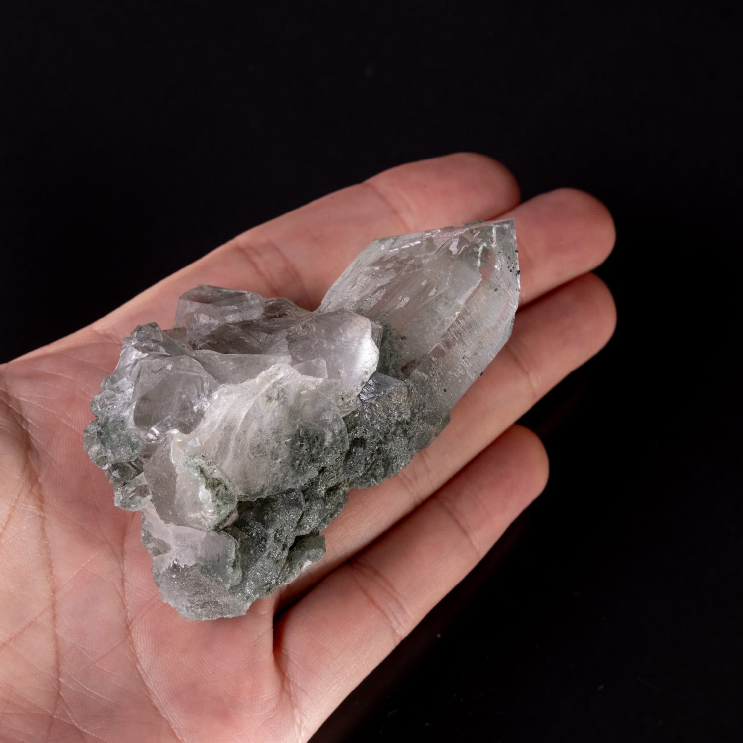 透明度が抜群の水晶にグリーンのクローライトが内包されファントムの形状になっているのが確認出来ます。セルフヒールドととれる形状やバーコード状の模様も見られ、ずっしりとした重量感が非常に魅力的です。