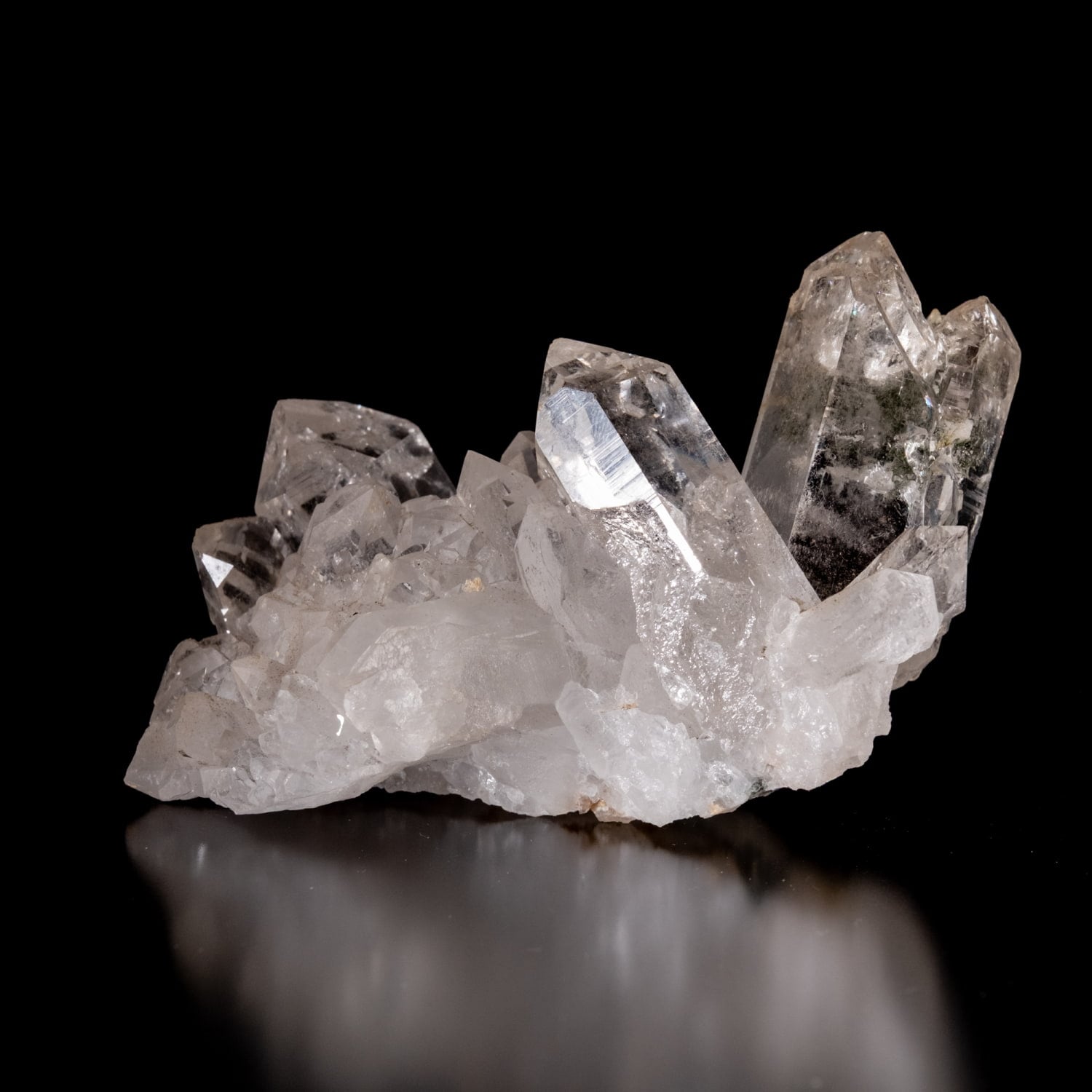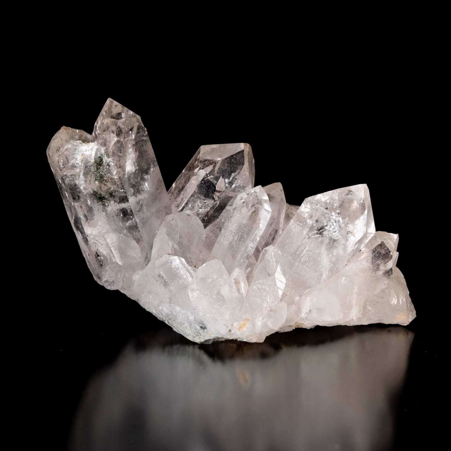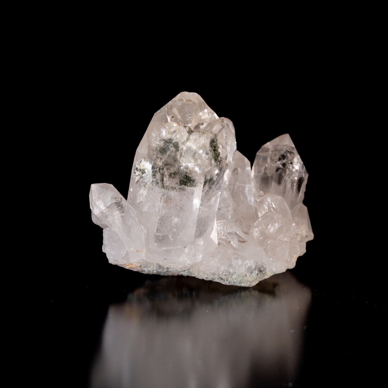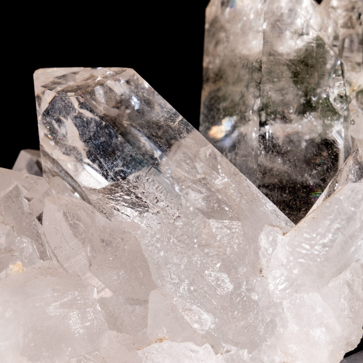 ・多様な表情: 緑色のクローライト(緑泥石)、黒色のアナテース(鋭錐石)、金色のルチル(金紅石)などが含まれる、個性豊かな結晶が見られます。