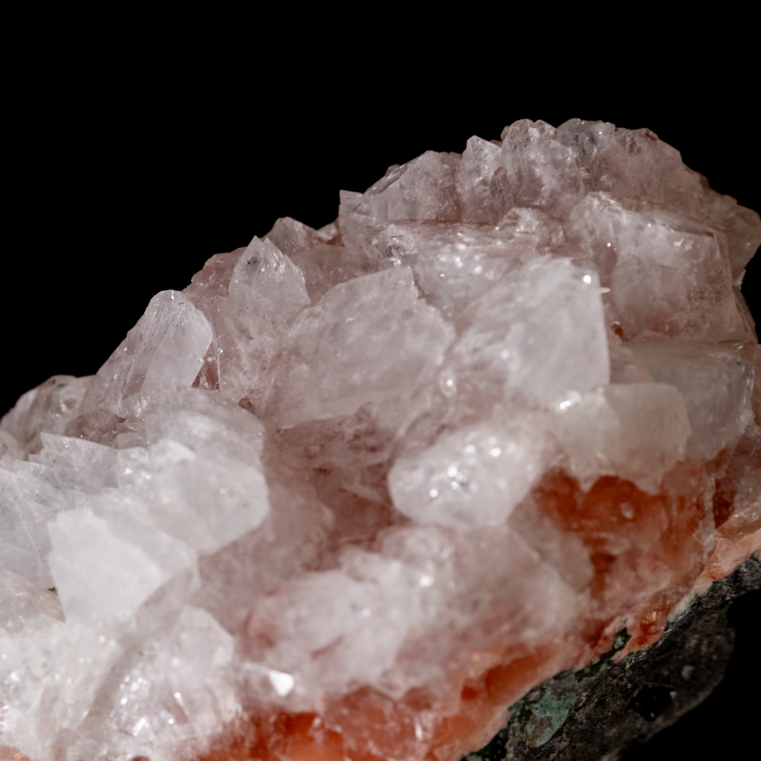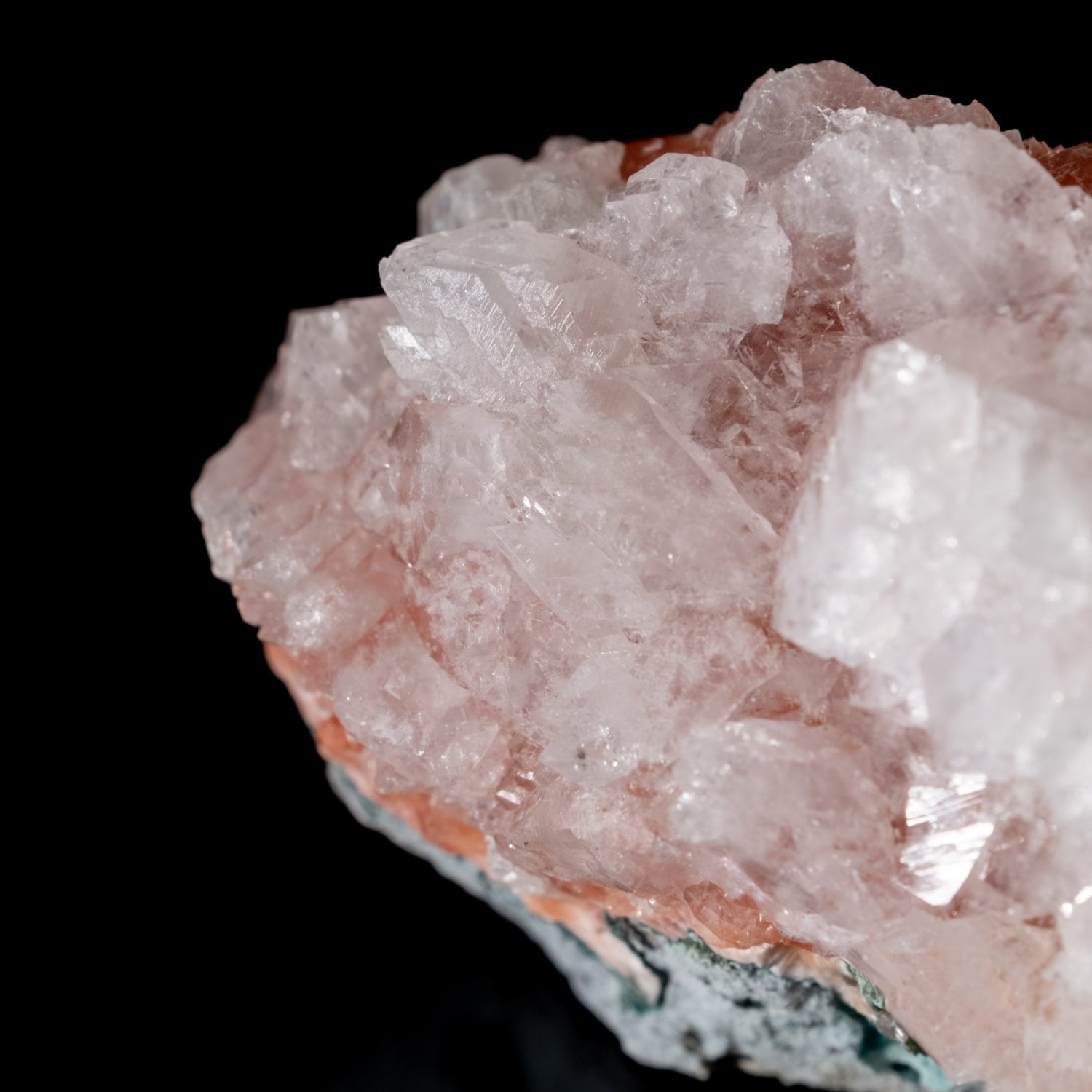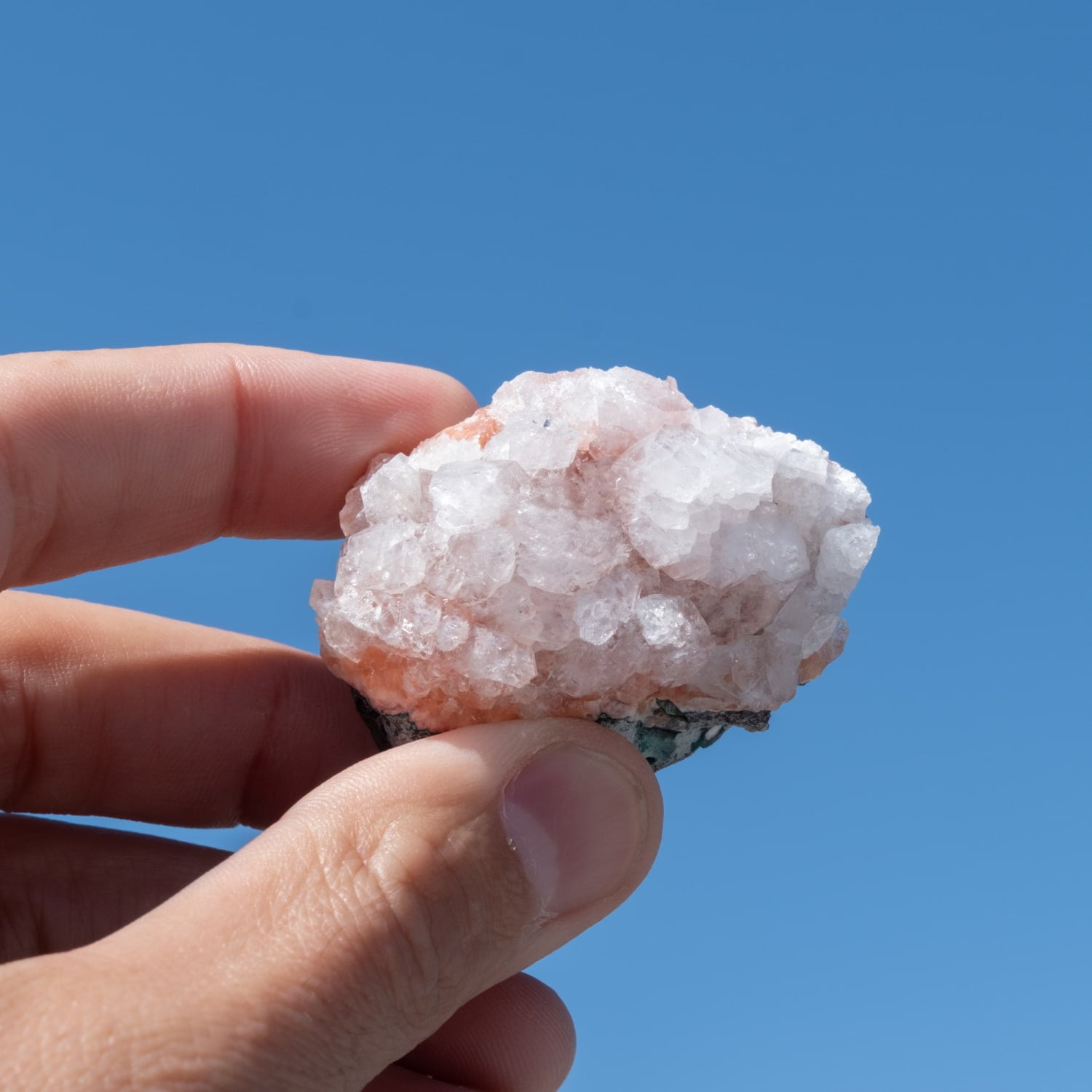 色合いの仕組み: 結晶の表面を覆った鉄分が、透明なアポフィライトを通して見えることで鮮やかな赤色を呈します。・主な産地: インド・マハラシュトラ州(アウランガーバード周辺など)が有名な産地です。