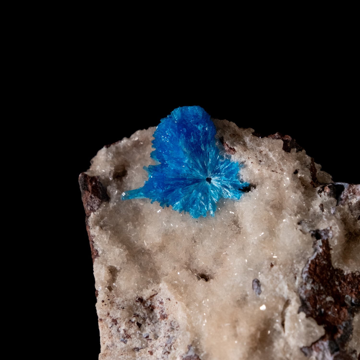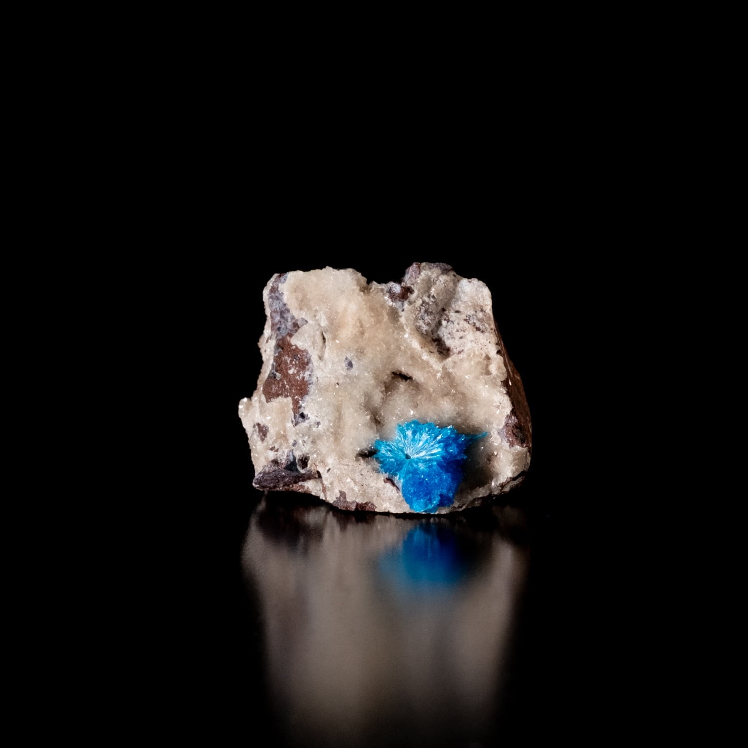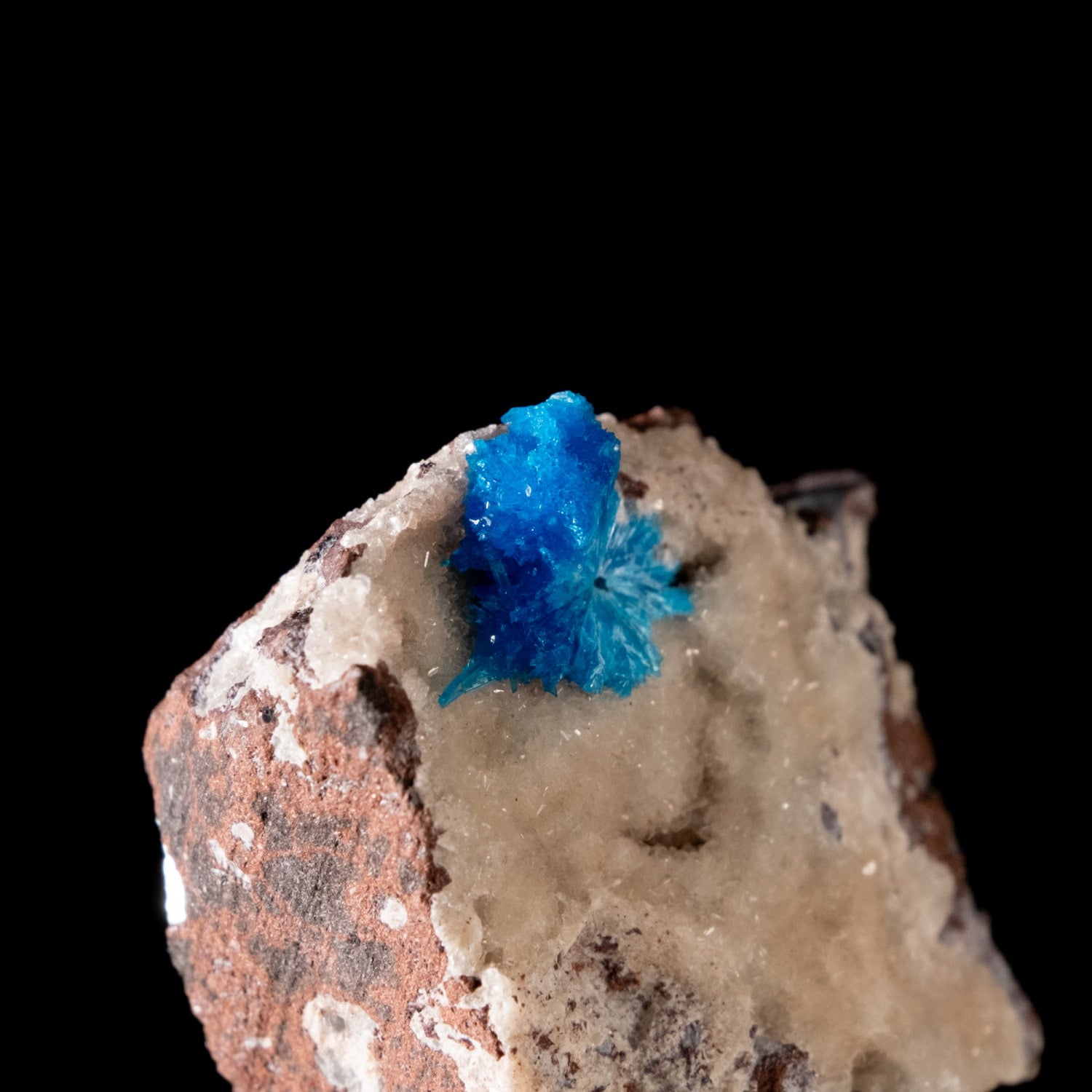 ・外観: 針状の結晶が放射状に成長し、母岩の上に「ポンポン」のような丸い球状クラスター(集合体)を作ります。白い沸石(スチルバイト等)を母岩として産出することが多く、青と白のコントラストが極めて美しいのが特徴です。