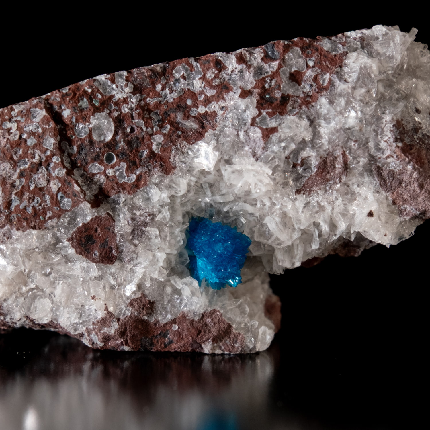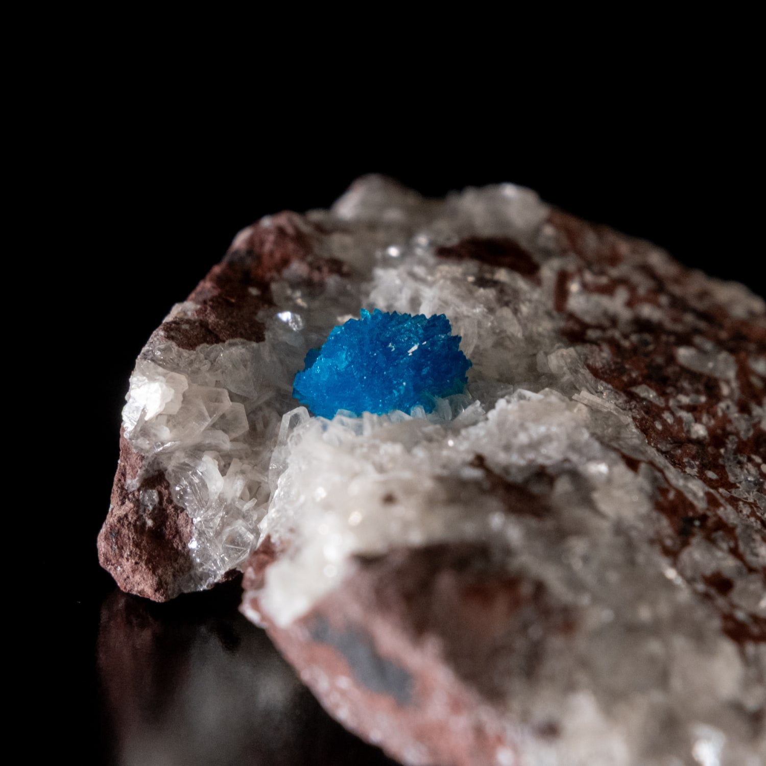 ・外観: 針状の結晶が放射状に成長し、母岩の上に「ポンポン」のような丸い球状クラスター(集合体)を作ります。白い沸石(スチルバイト等)を母岩として産出することが多く、青と白のコントラストが極めて美しいのが特徴です。