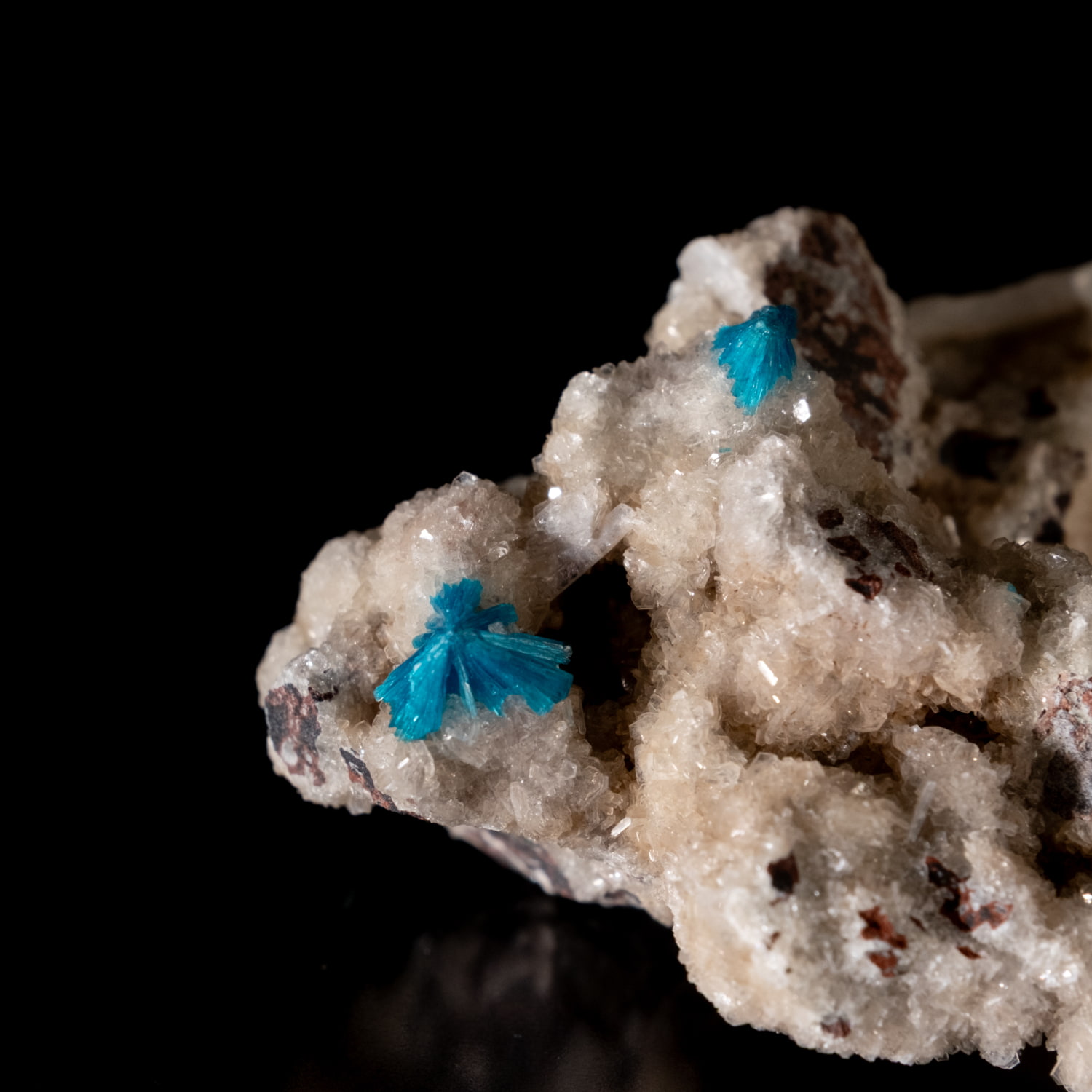 ・外観: 針状の結晶が放射状に成長し、母岩の上に「ポンポン」のような丸い球状クラスター(集合体)を作ります。白い沸石(スチルバイト等)を母岩として産出することが多く、青と白のコントラストが極めて美しいのが特徴です。