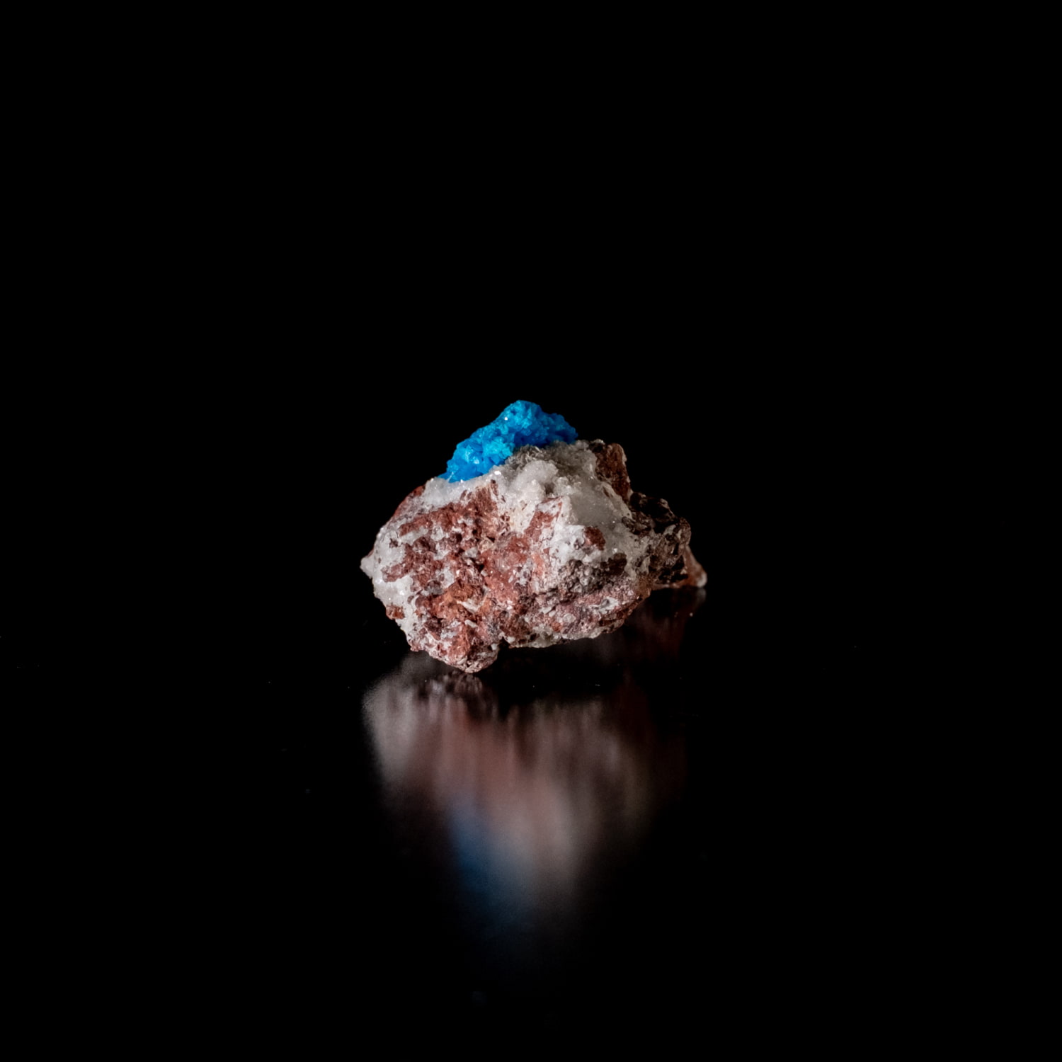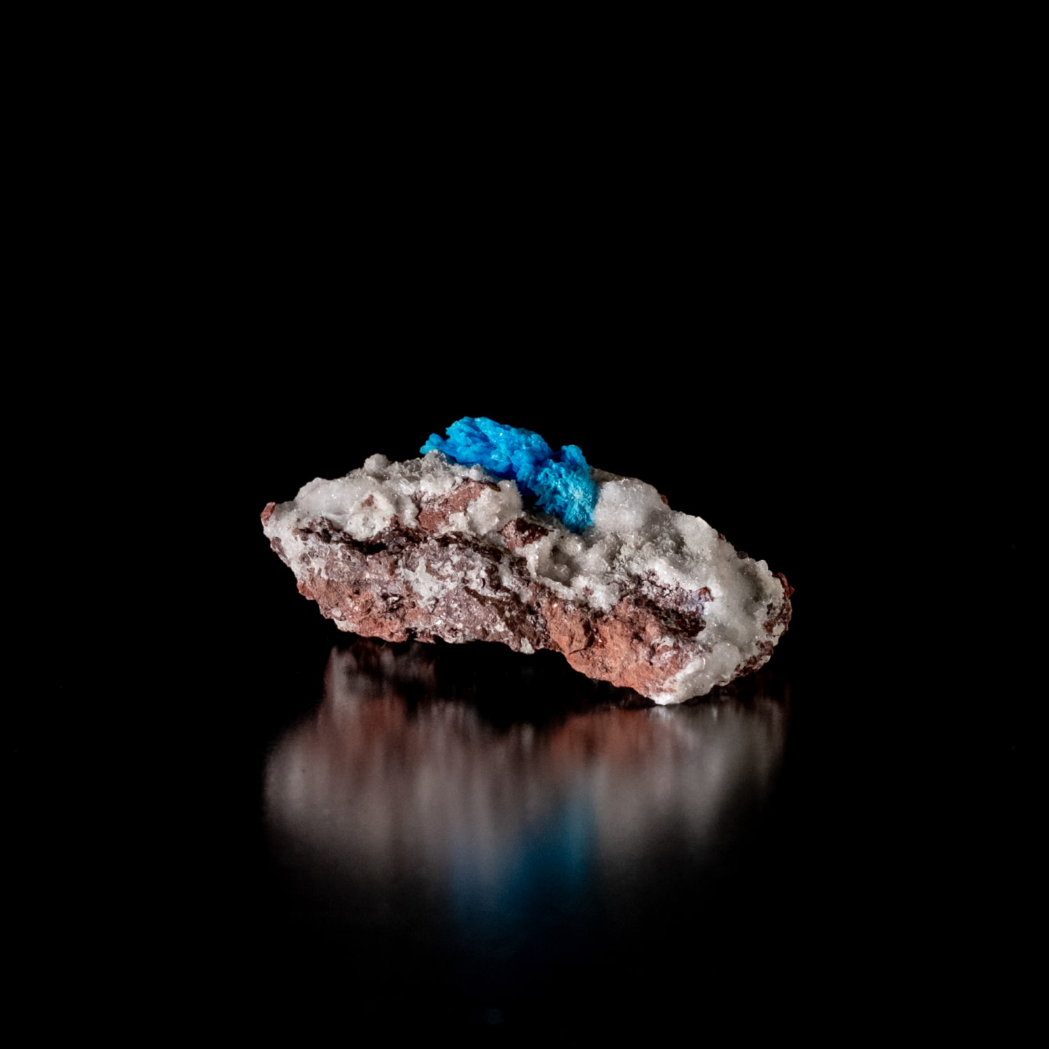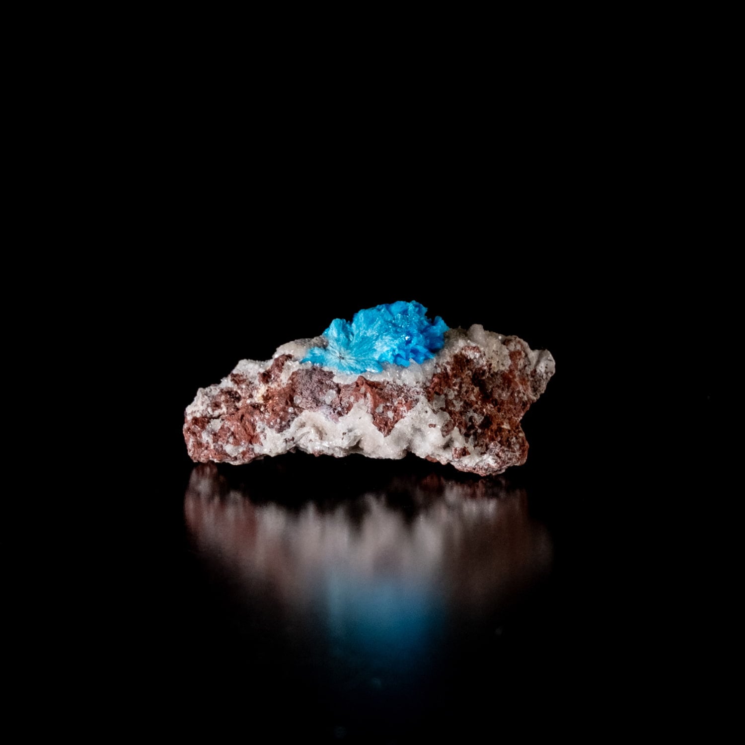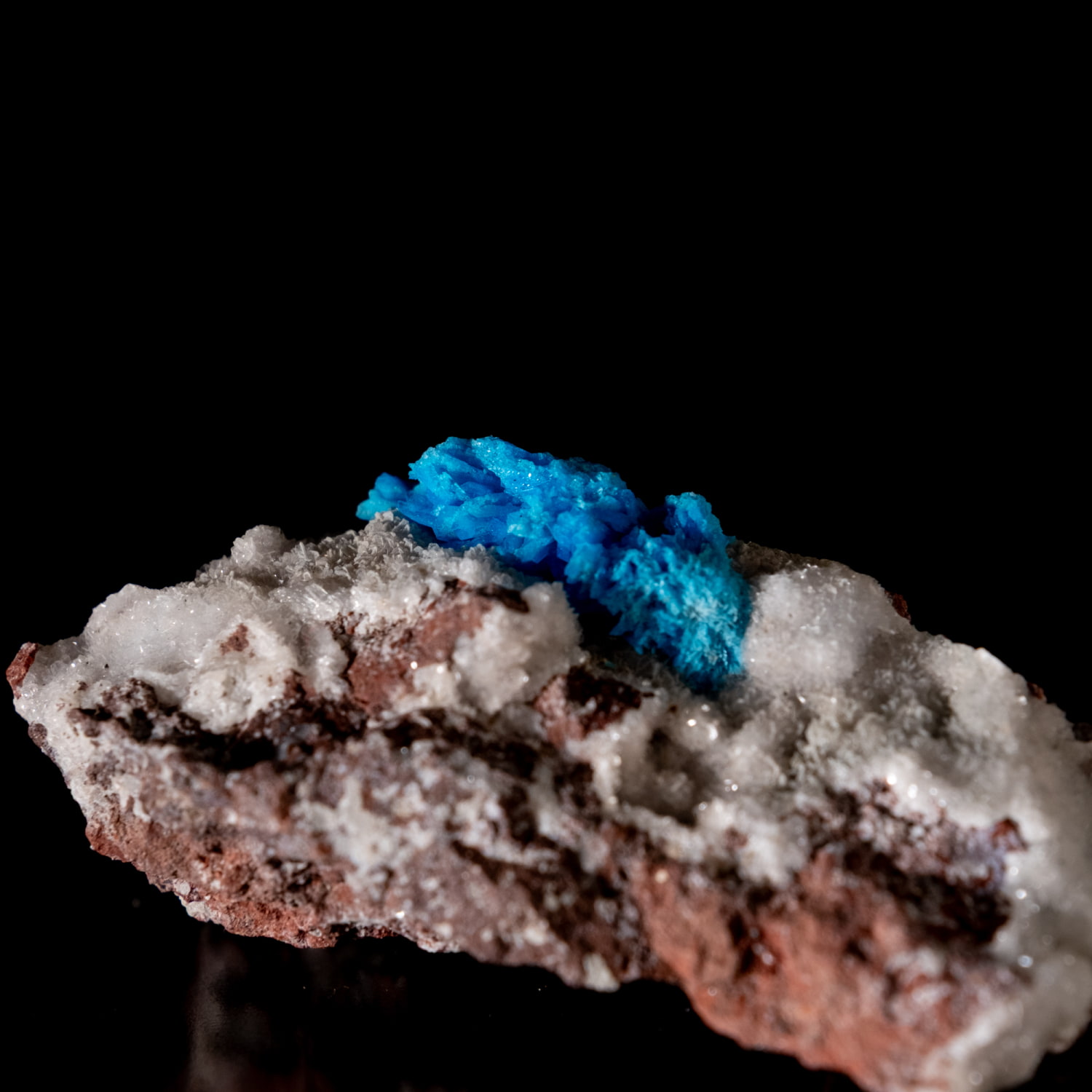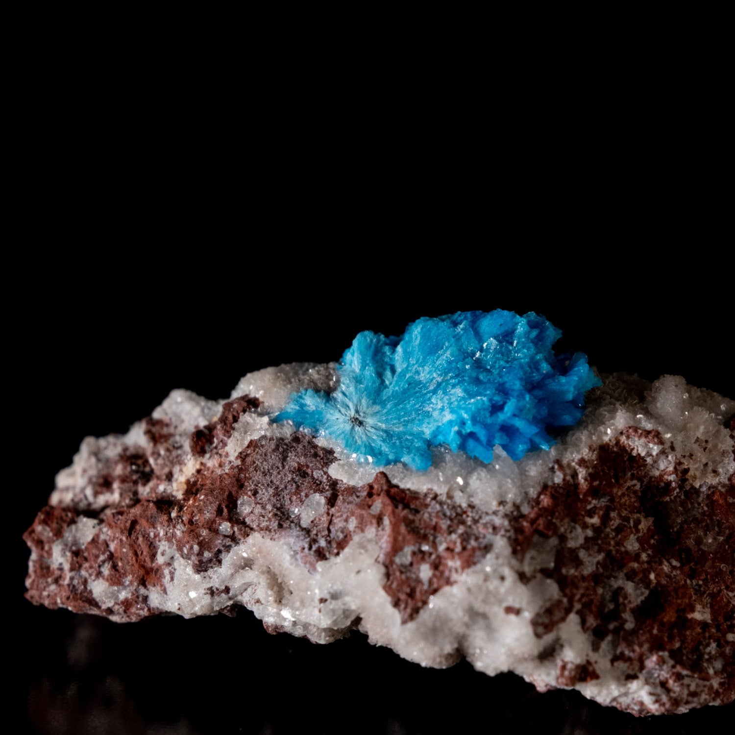 ・外観: 針状の結晶が放射状に成長し、母岩の上に「ポンポン」のような丸い球状クラスター(集合体)を作ります。白い沸石(スチルバイト等)を母岩として産出することが多く、青と白のコントラストが極めて美しいのが特徴です。