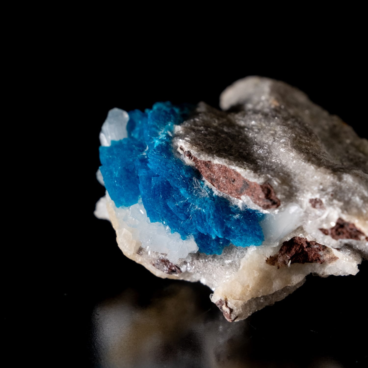・外観: 針状の結晶が放射状に成長し、母岩の上に「ポンポン」のような丸い球状クラスター(集合体)を作ります。白い沸石(スチルバイト等)を母岩として産出することが多く、青と白のコントラストが極めて美しいのが特徴です。