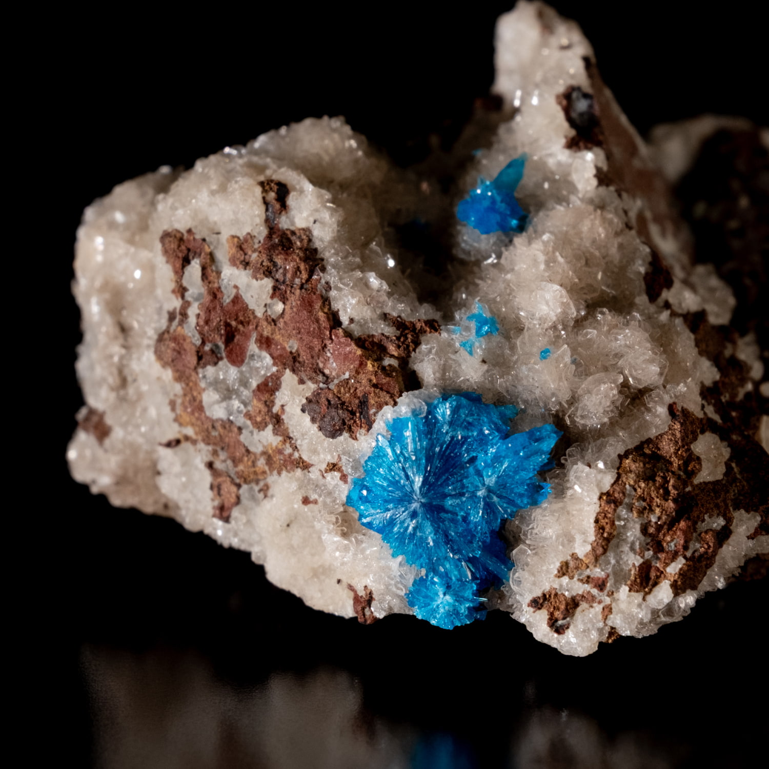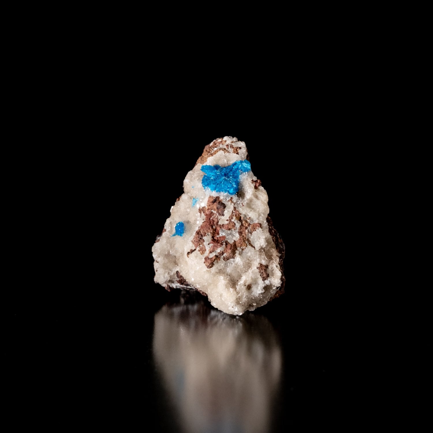 ・外観: 針状の結晶が放射状に成長し、母岩の上に「ポンポン」のような丸い球状クラスター(集合体)を作ります。白い沸石(スチルバイト等)を母岩として産出することが多く、青と白のコントラストが極めて美しいのが特徴です。