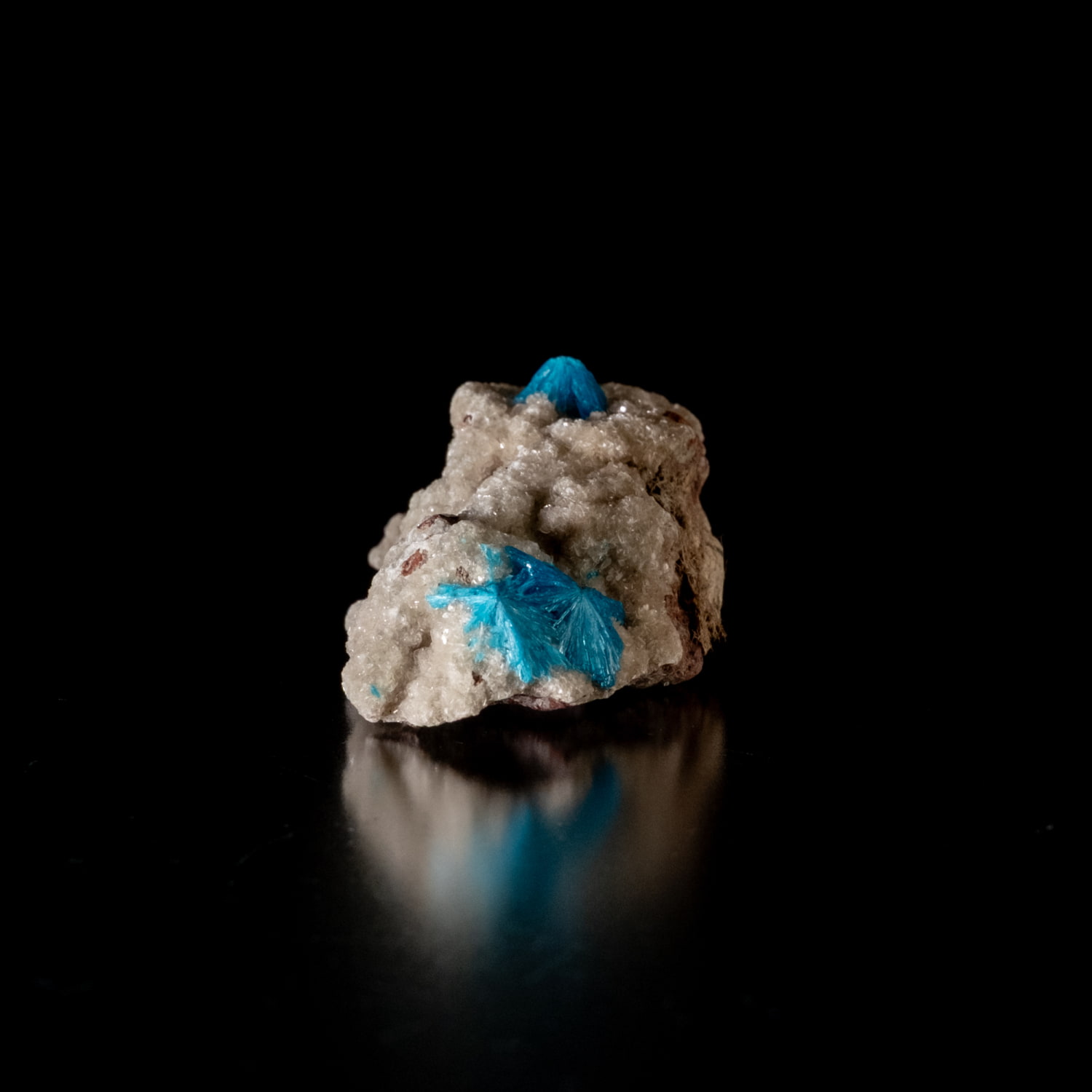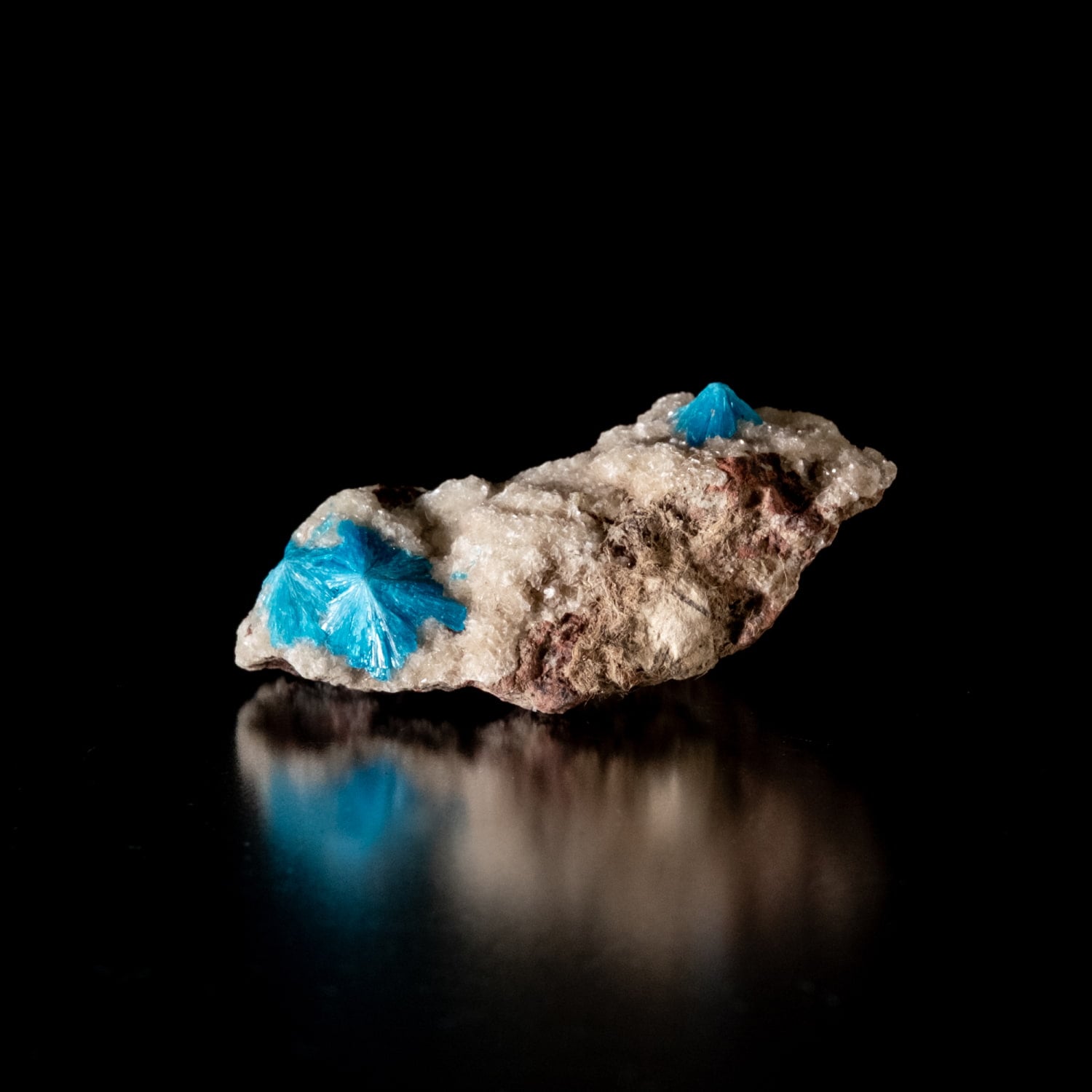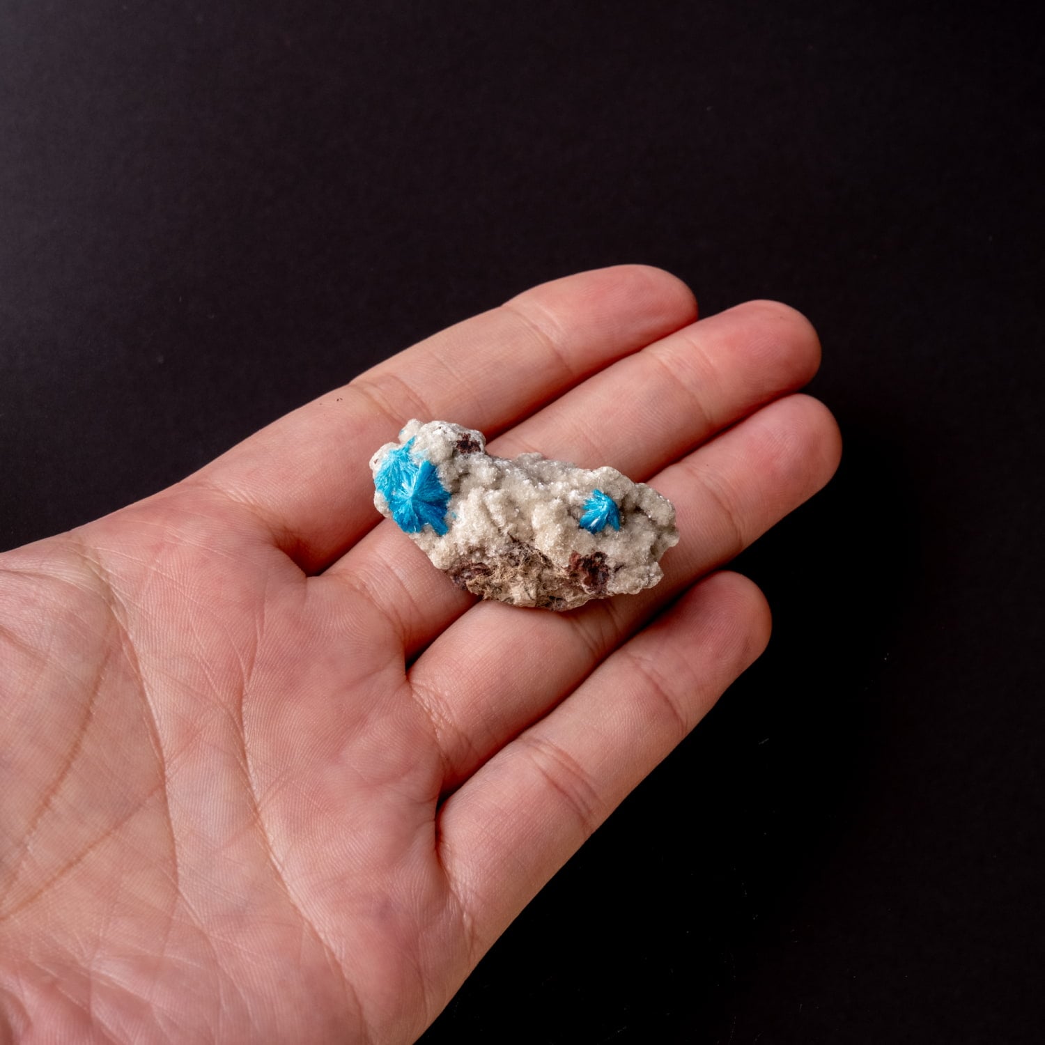 ・外観: 針状の結晶が放射状に成長し、母岩の上に「ポンポン」のような丸い球状クラスター(集合体)を作ります。白い沸石(スチルバイト等)を母岩として産出することが多く、青と白のコントラストが極めて美しいのが特徴です。