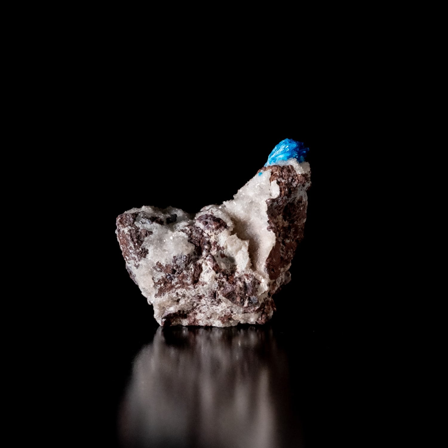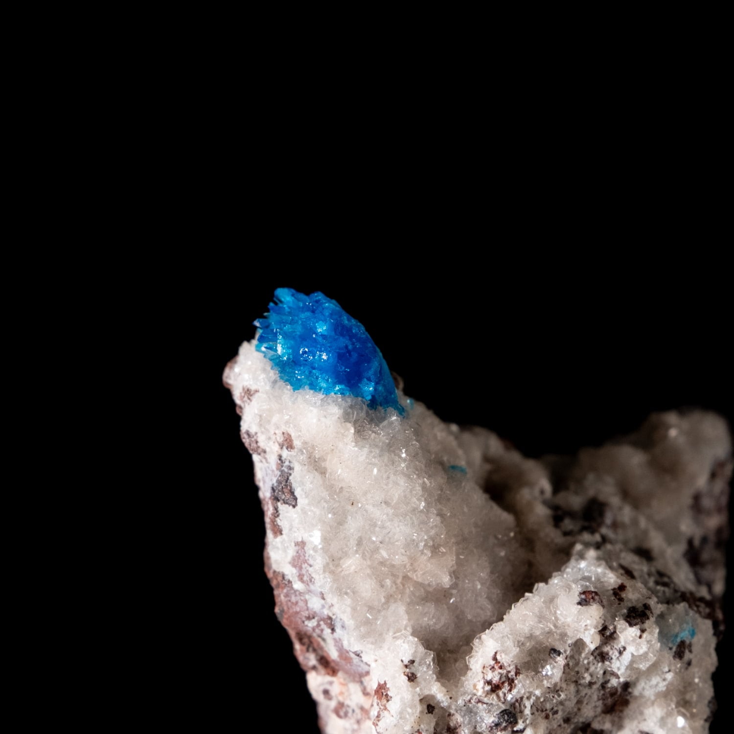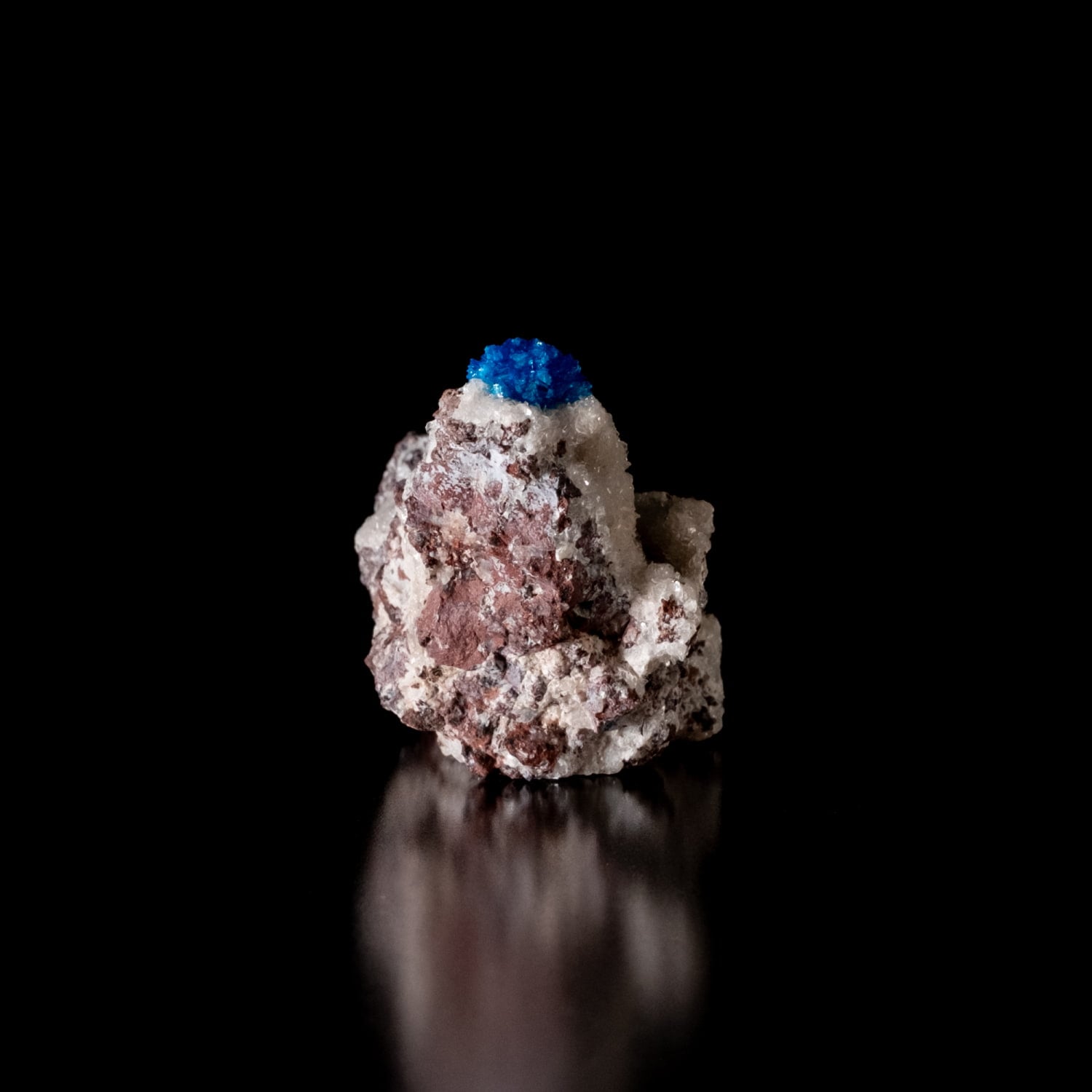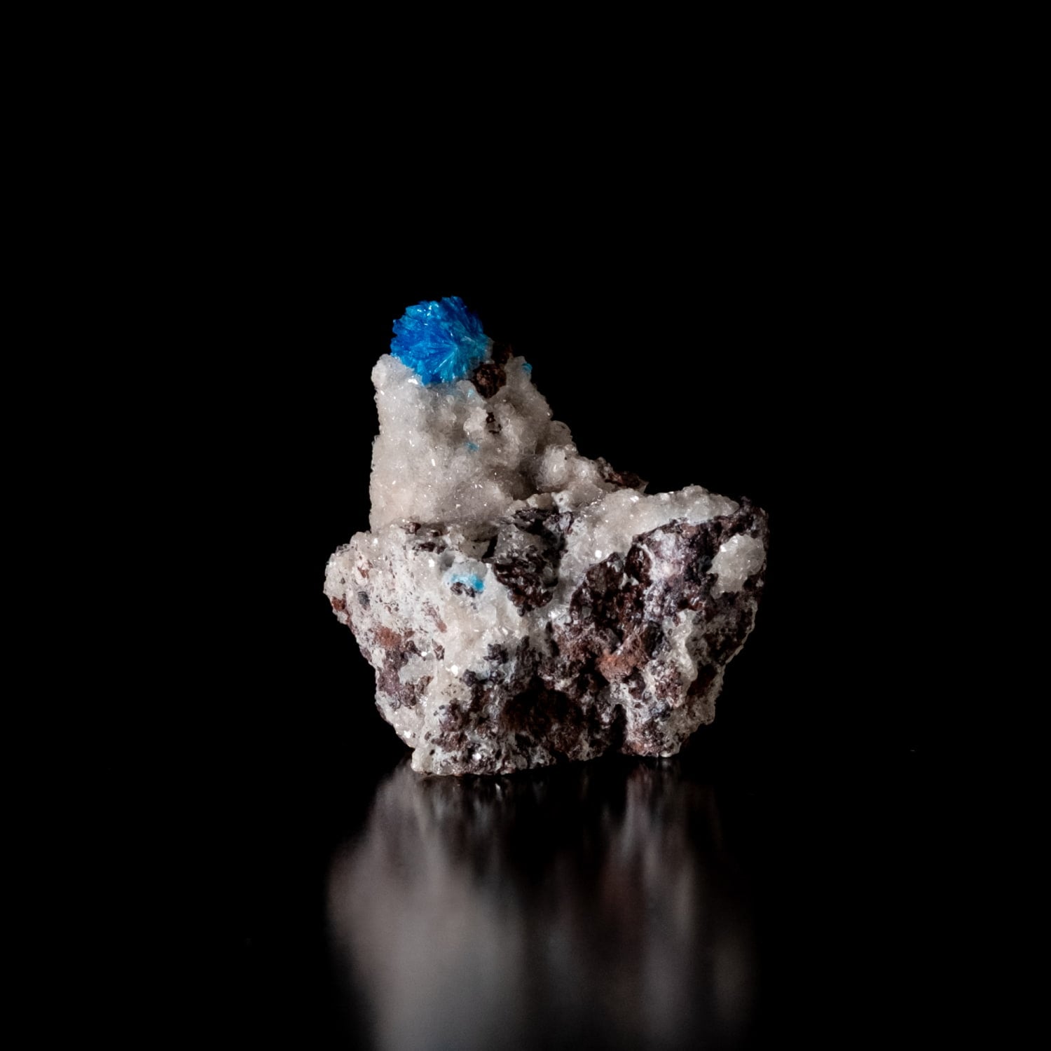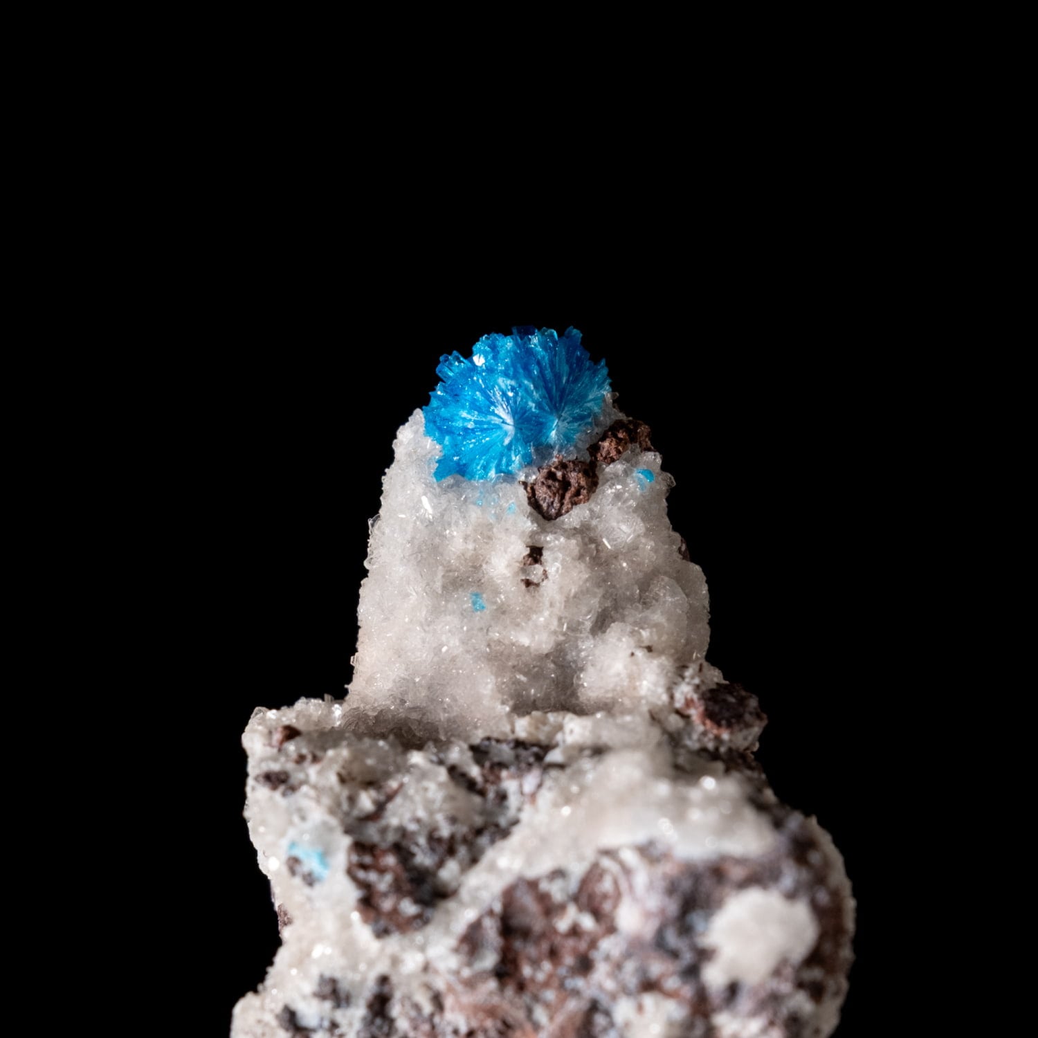 ・外観: 針状の結晶が放射状に成長し、母岩の上に「ポンポン」のような丸い球状クラスター(集合体)を作ります。白い沸石(スチルバイト等)を母岩として産出することが多く、青と白のコントラストが極めて美しいのが特徴です。