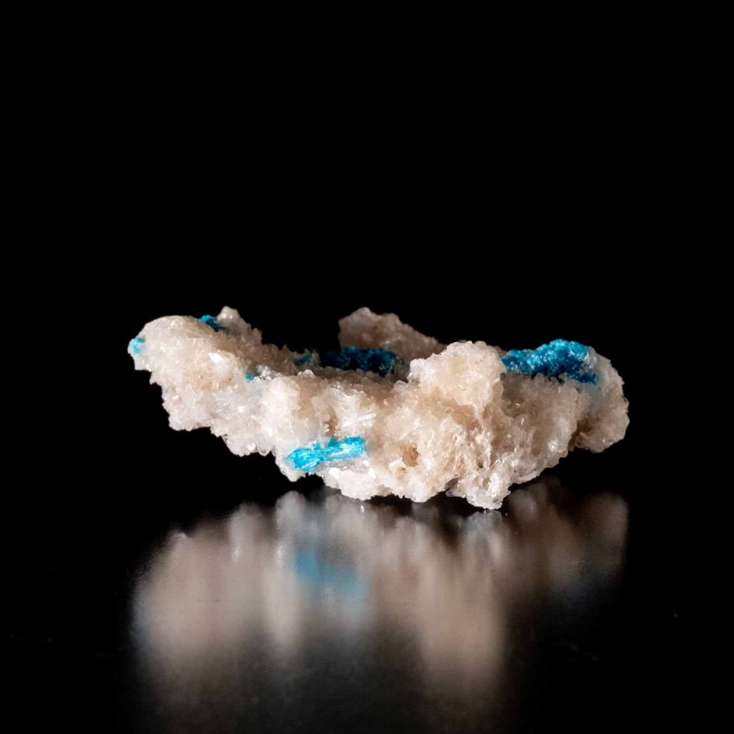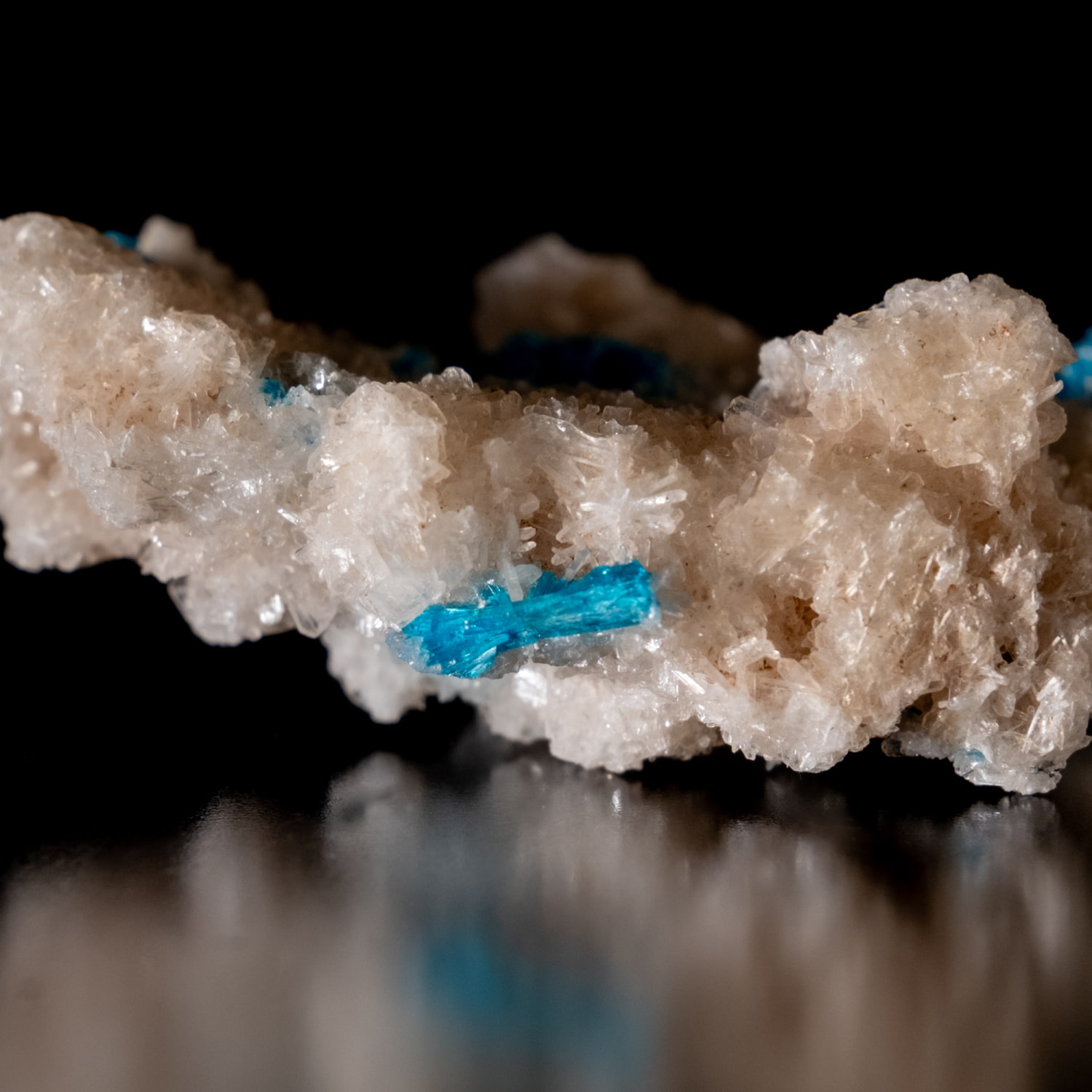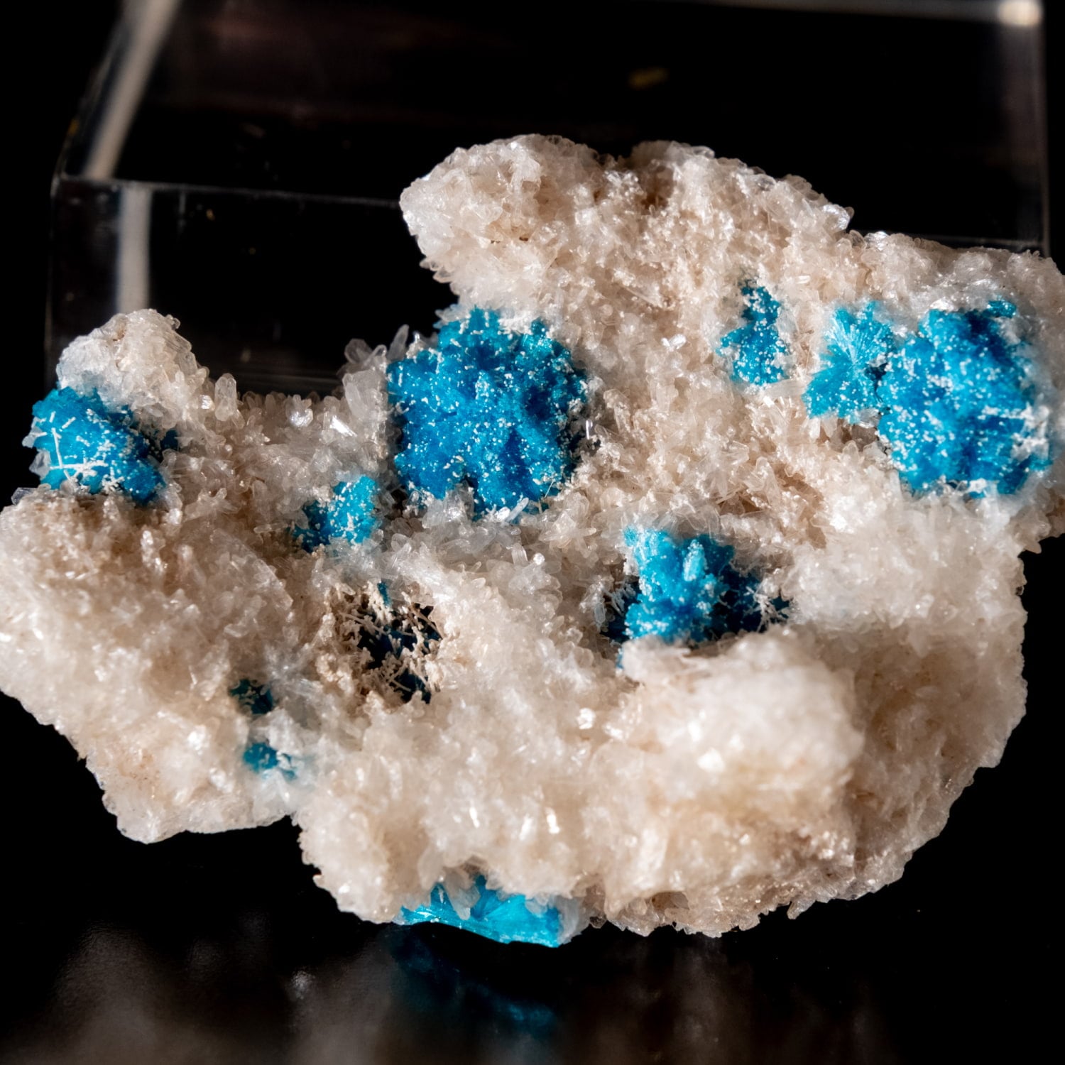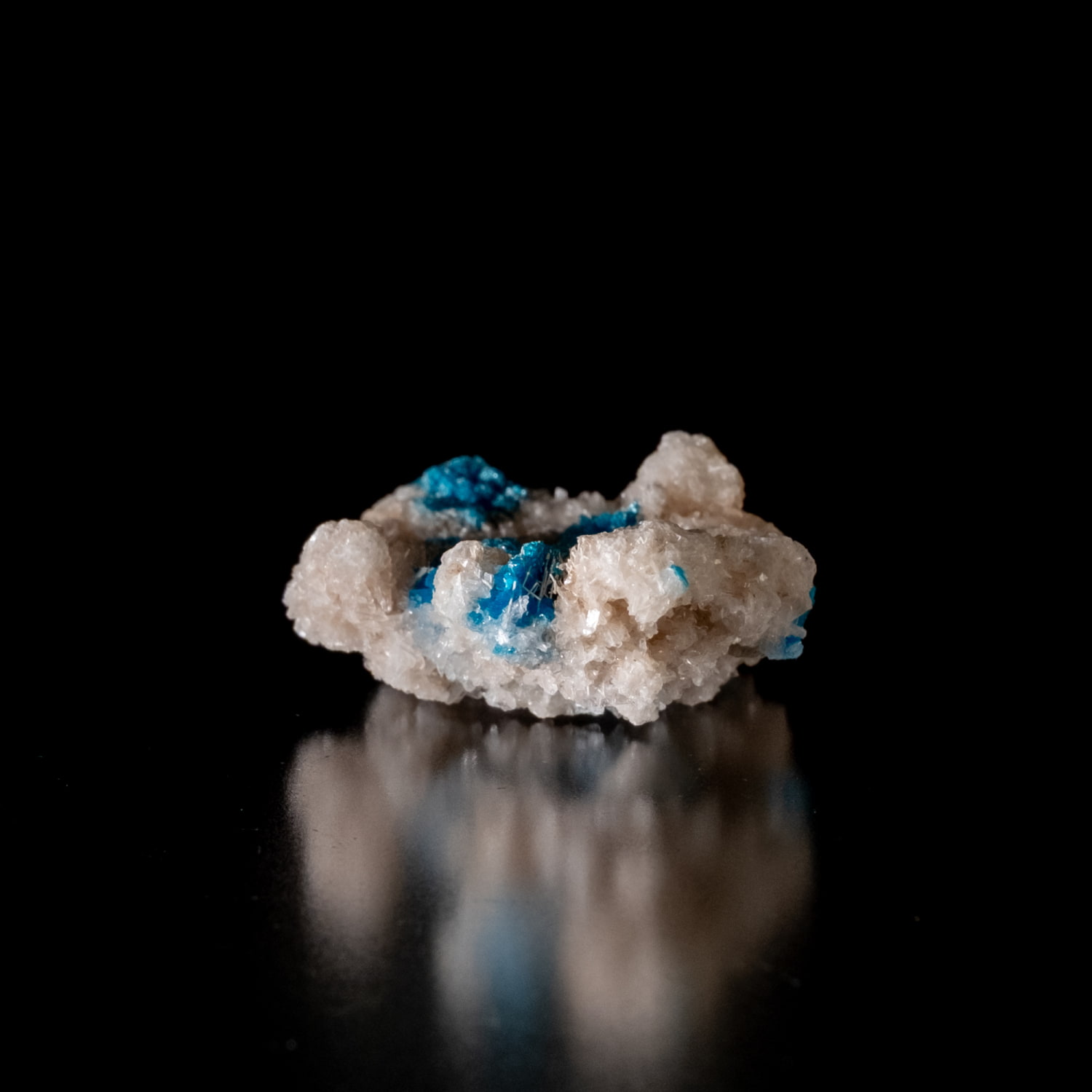 ・外観: 針状の結晶が放射状に成長し、母岩の上に「ポンポン」のような丸い球状クラスター(集合体)を作ります。白い沸石(スチルバイト等)を母岩として産出することが多く、青と白のコントラストが極めて美しいのが特徴です。