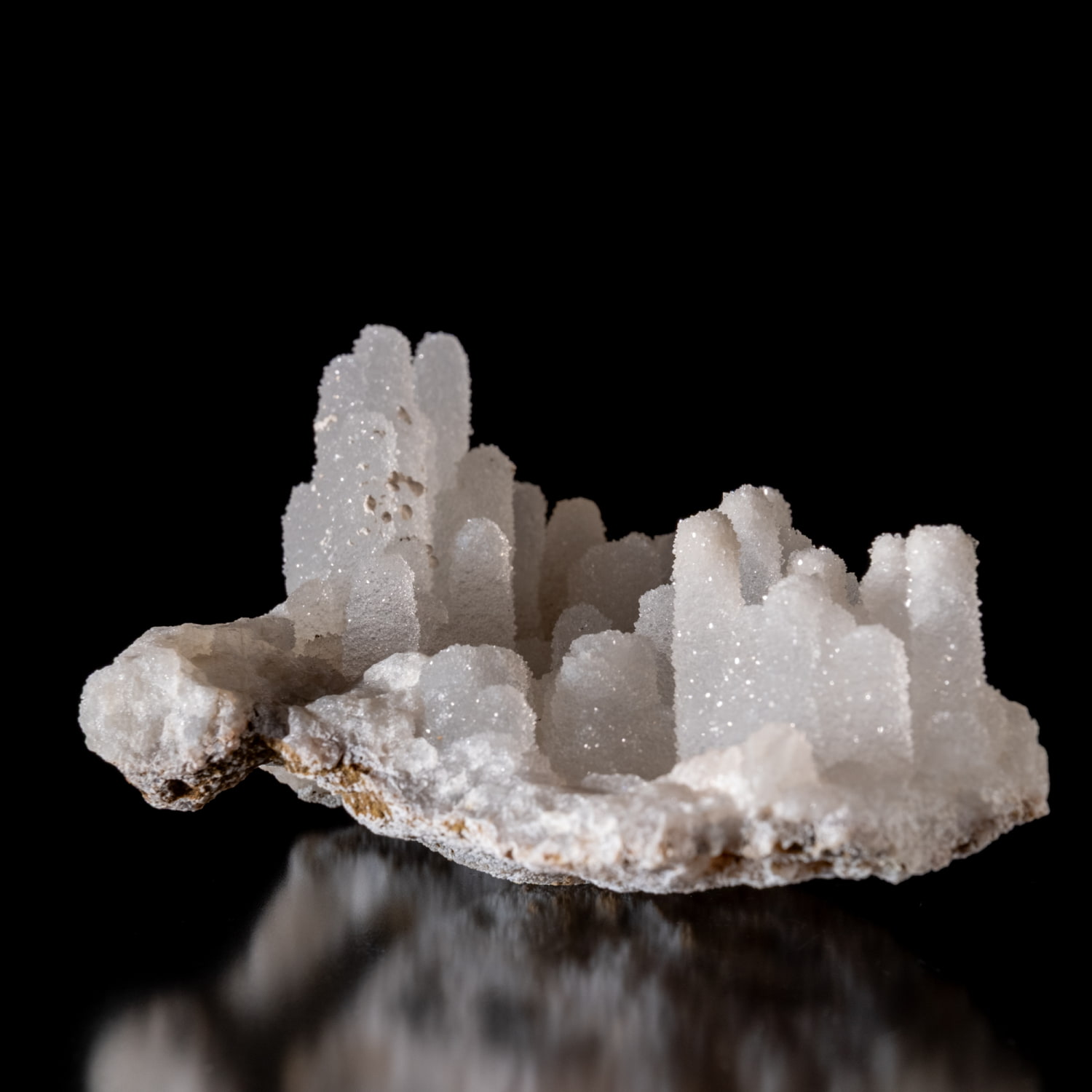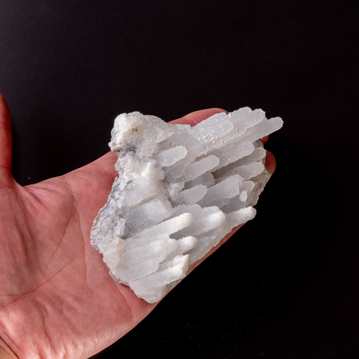 表面のざらついた質感が特徴的で、これだけの形状が残っているのは非常に珍しいです。天然石好きの方には一度は手に取って戴きたい商品です。芯となる柱状の結晶を、無数の微細な水晶が粉雪のように覆い、非常に繊細で神秘的な輝きを放っています。