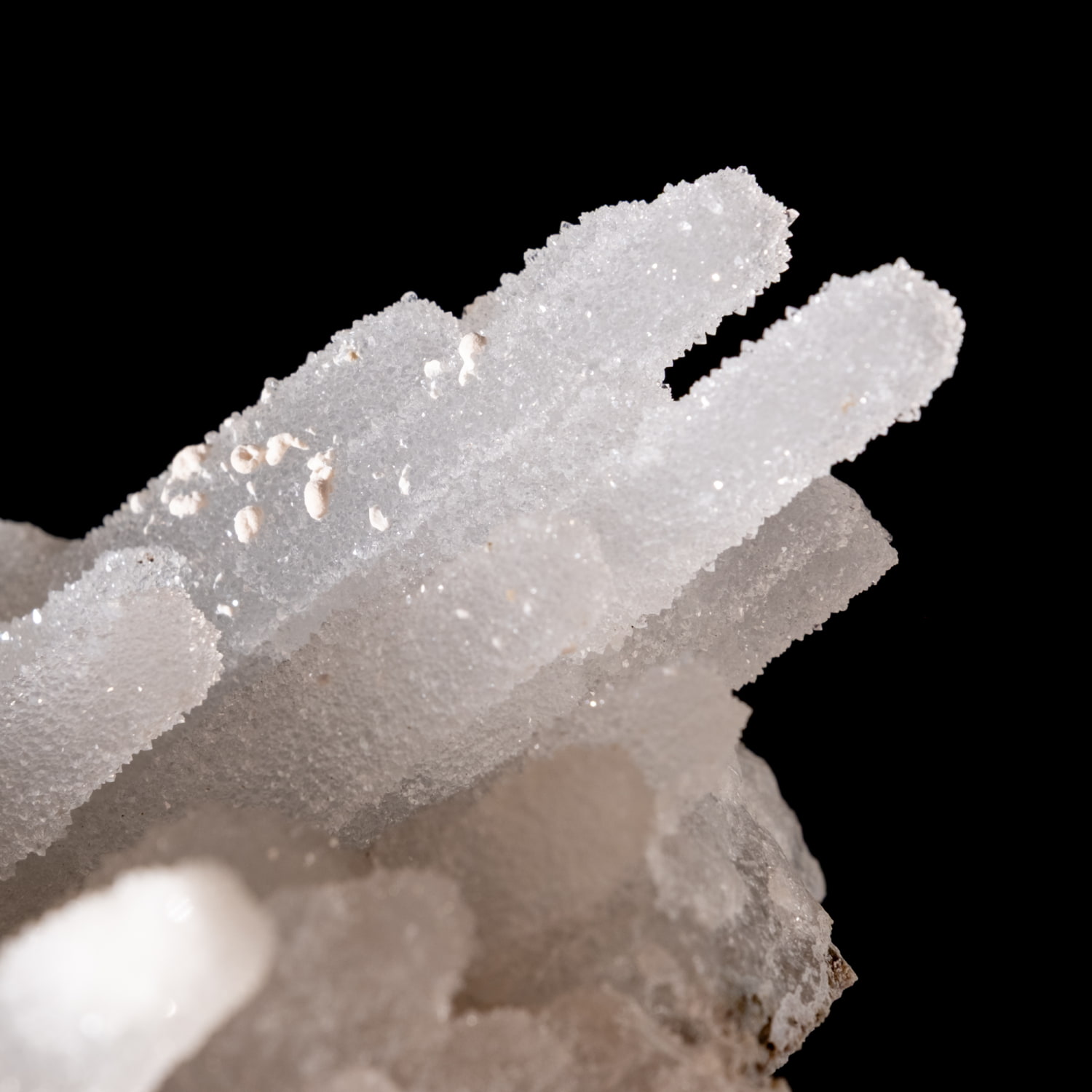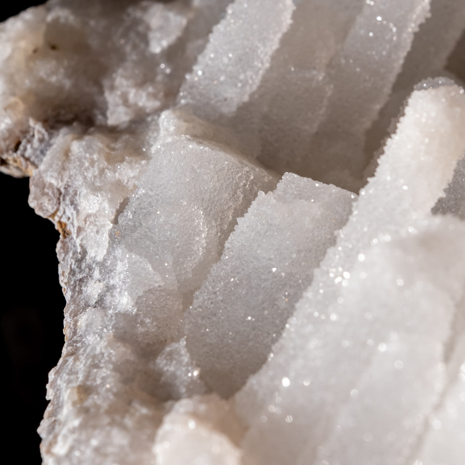 輝きの仕組み:主成分である二酸化ケイ素の微細な結晶(水晶)が表面をびっしりと覆っています。この無数の結晶面が光を乱反射させることで、砂糖をまぶしたような特有の煌めきが生まれます。・主な産地:インド・マハラシュトラ州(プーナ周辺など)が、このような高品質な集晶の産地として世界的に有名です。